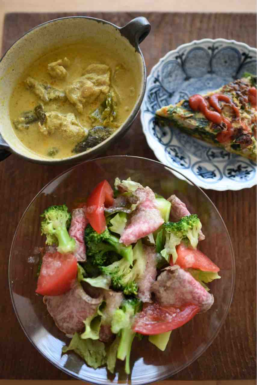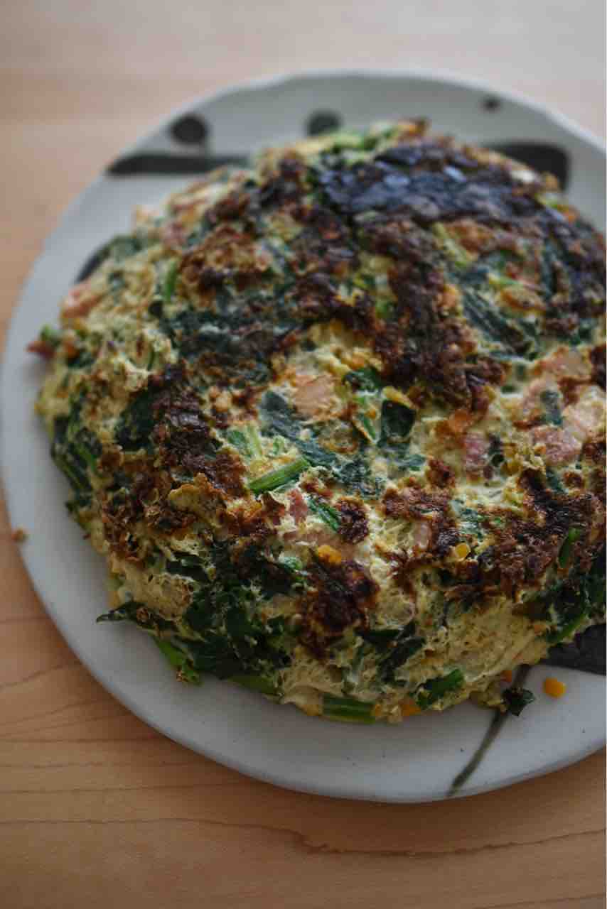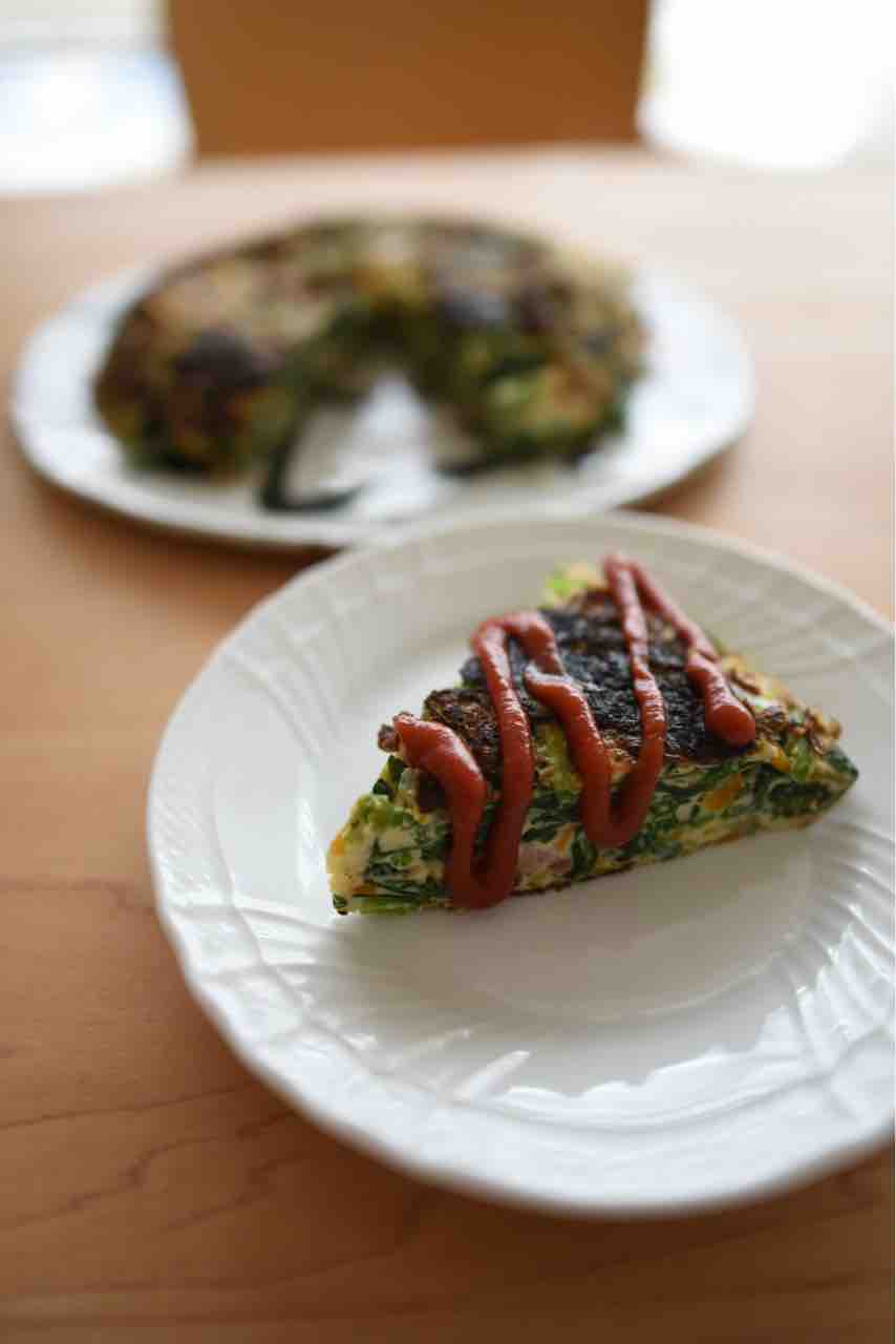 卵、ベーコン、玉ねぎ、ほうれん草、にんじん でスペイン風オムレツも作りました。本当はじゃがいもが入るのですが、なかったのであるものだけで作りました。