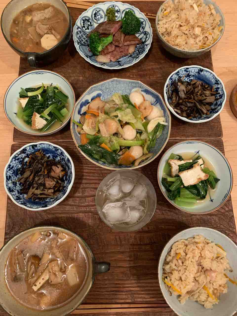 鶏肉、ごぼう、にんじん、油揚げ で炊き込みご飯を作りました。豚ばら肉、厚揚げ、里芋、大根、にんじん、ごぼう で豚汁も作りました。