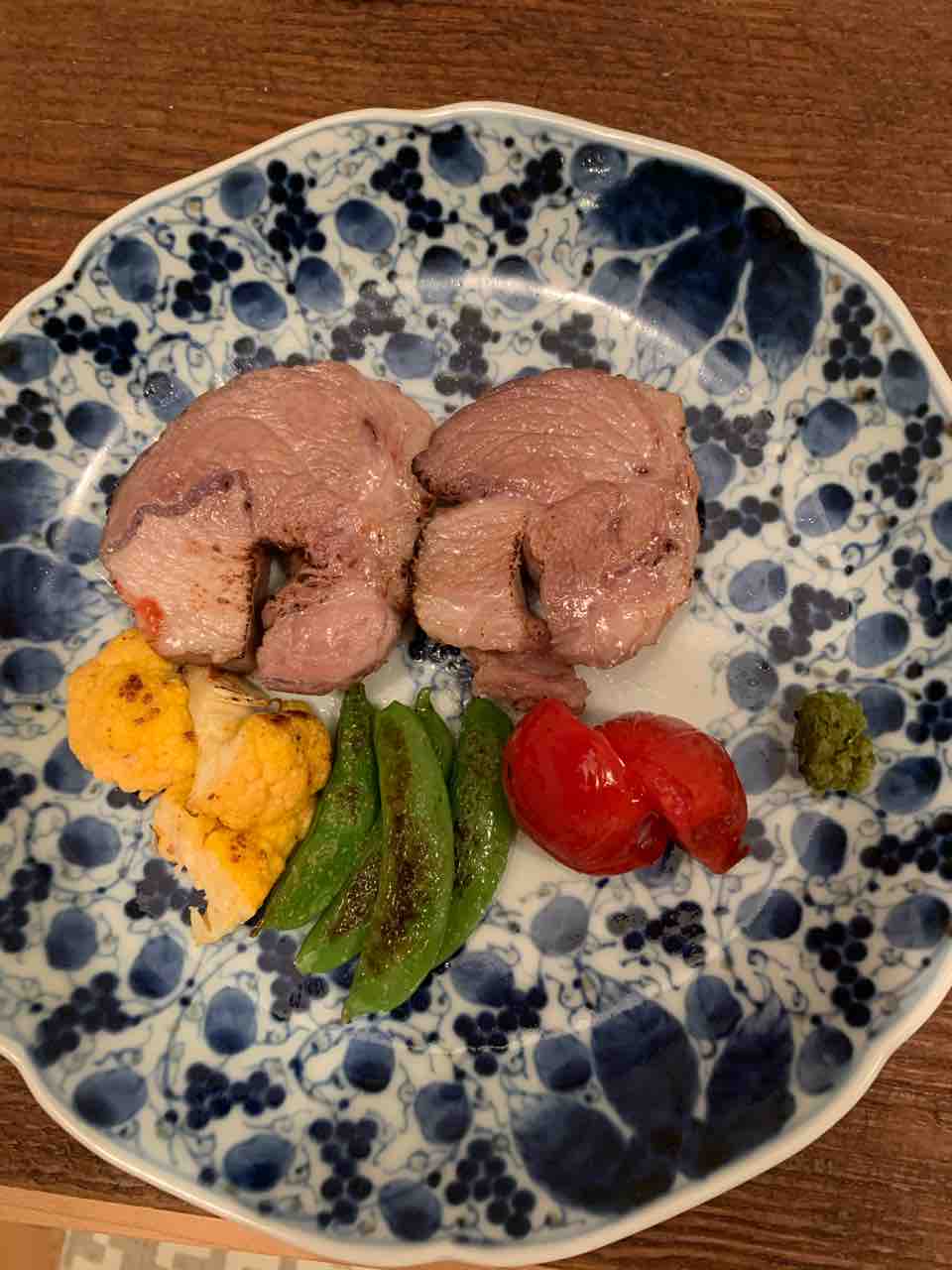 豚肩ロースブロックに塩麹をまぶして63℃6時間で低温調理し、表面をバーナーで炙り、カリフラワー、スナップエンドウ、ミニトマトを焼いたものと合わせました。自家製の国産ライム唐辛子(柚子胡椒のライム版)をつけて食べたらすごくおいしかったです。塩麹は、電気IH圧力なべで以前作ったものです。