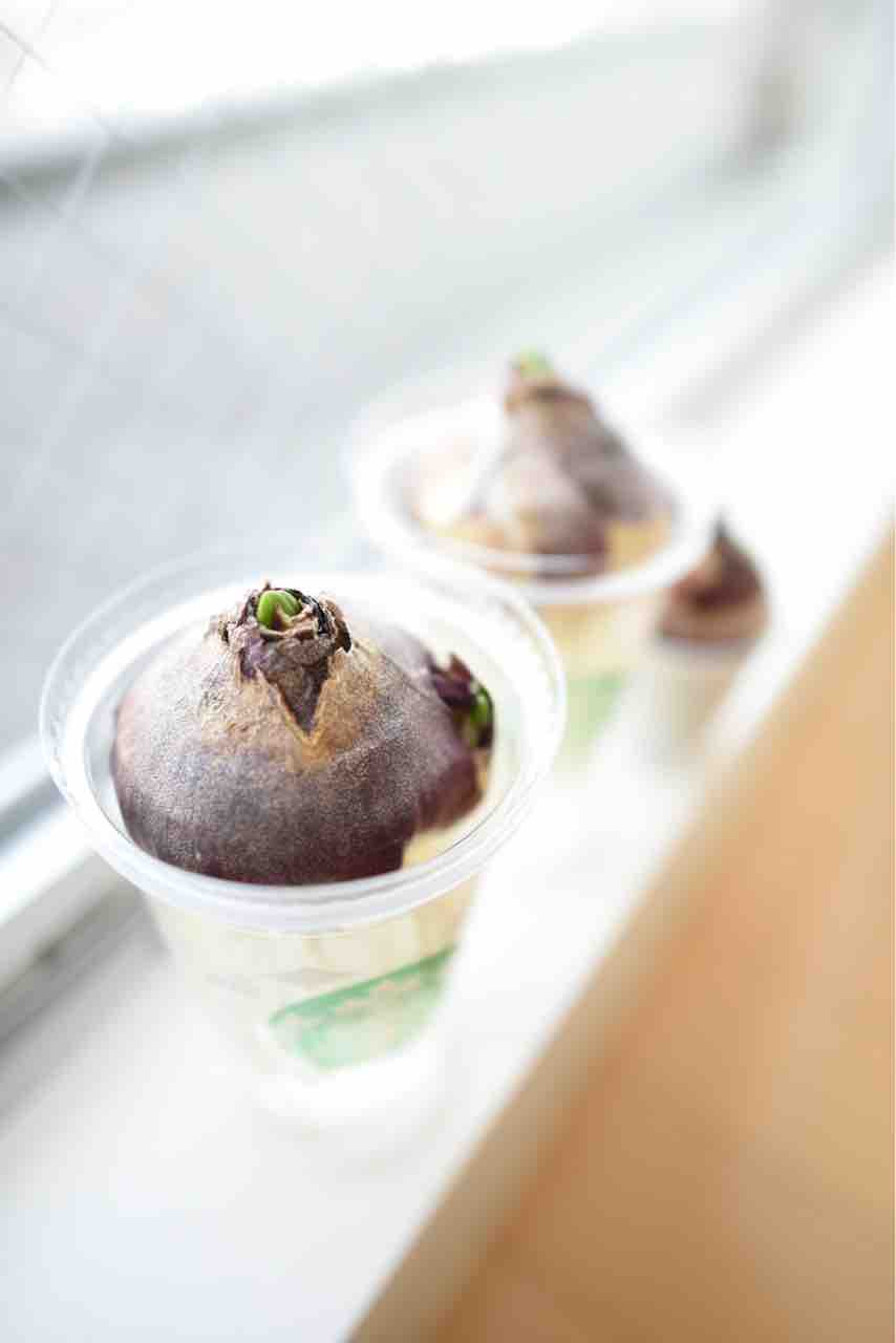 スターバックスのフラペチーノの空き容器を利用したヒヤシンスも、良い感じです。
