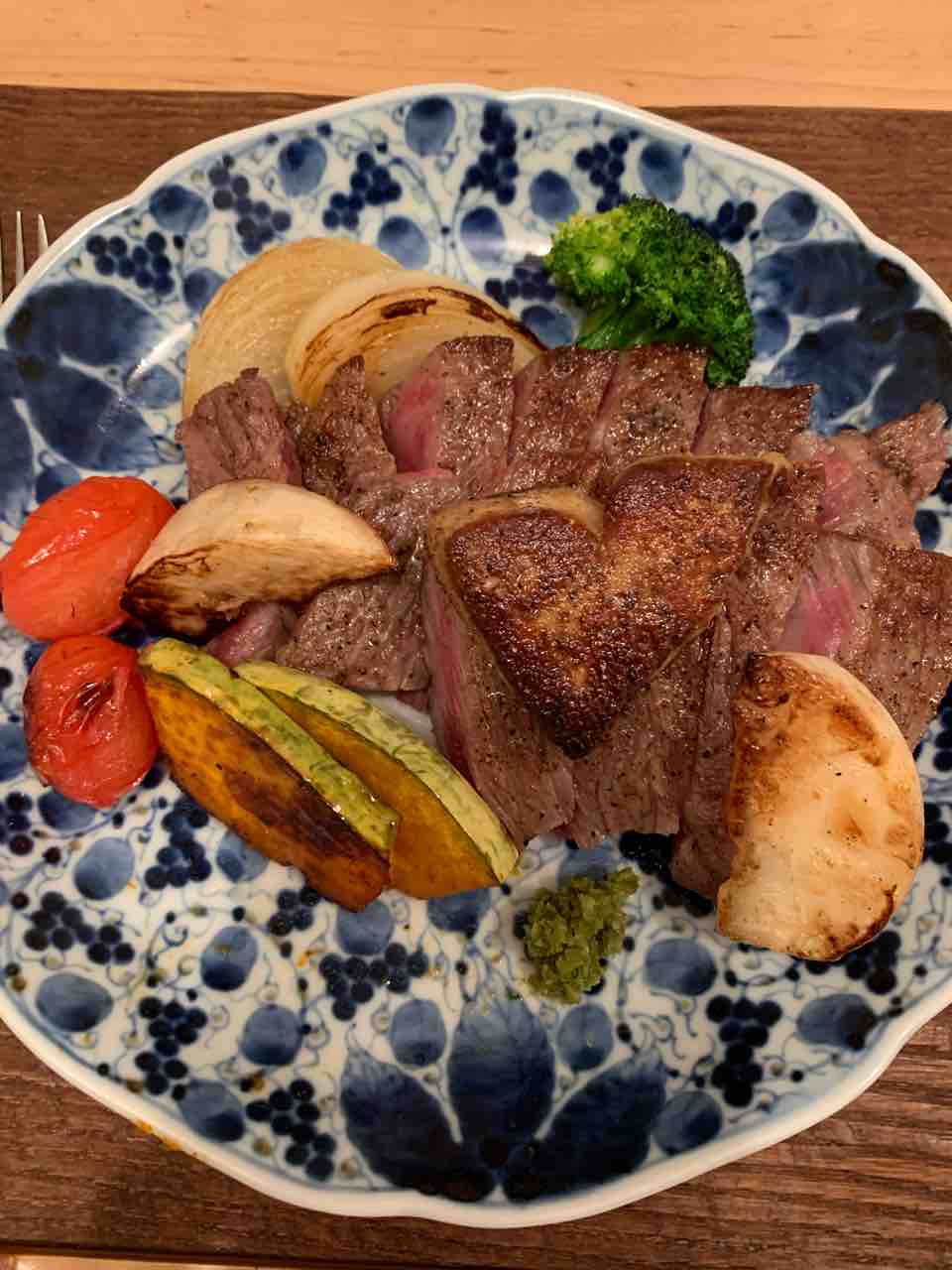 サーロインのミディアムレアも好きですが、焼き野菜はもっと好きです。今回、玉ねぎ、ブロッコリー、かぶ、ミニトマト、南瓜 を焼きました。いただいたフォアグラは小麦粉をはたいてバターソテーにしました。自家製の「国産ライム唐辛子」(柚子胡椒のライムバージョン)をつけて食べたらすごくおいしかったです。