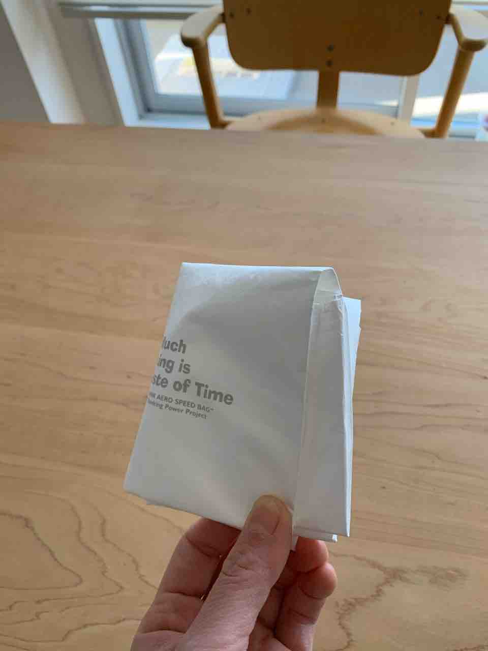 これは、タイベックという、紙のように薄くて軽い不織布でできており、小さく薄く折りたためる上、重量も25gしかありません。
