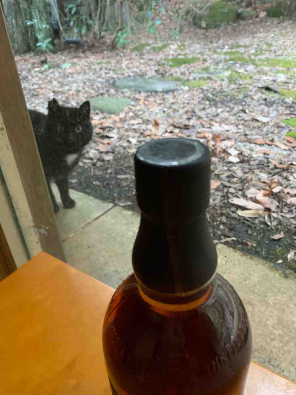 余談ですが、出張先の静岡にて入手、ボトルの撮影をしていたら、黒猫が写り込んできました。めしが目当てです。もちろん糖質ゼロの飯をご馳走しています。