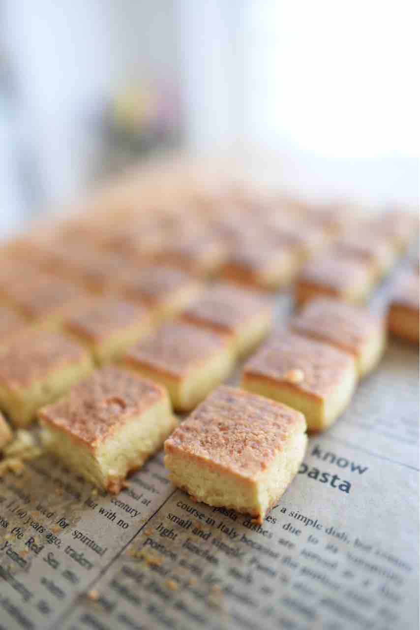 - 生地を2cm角に包丁し、160℃で20分焼きます。