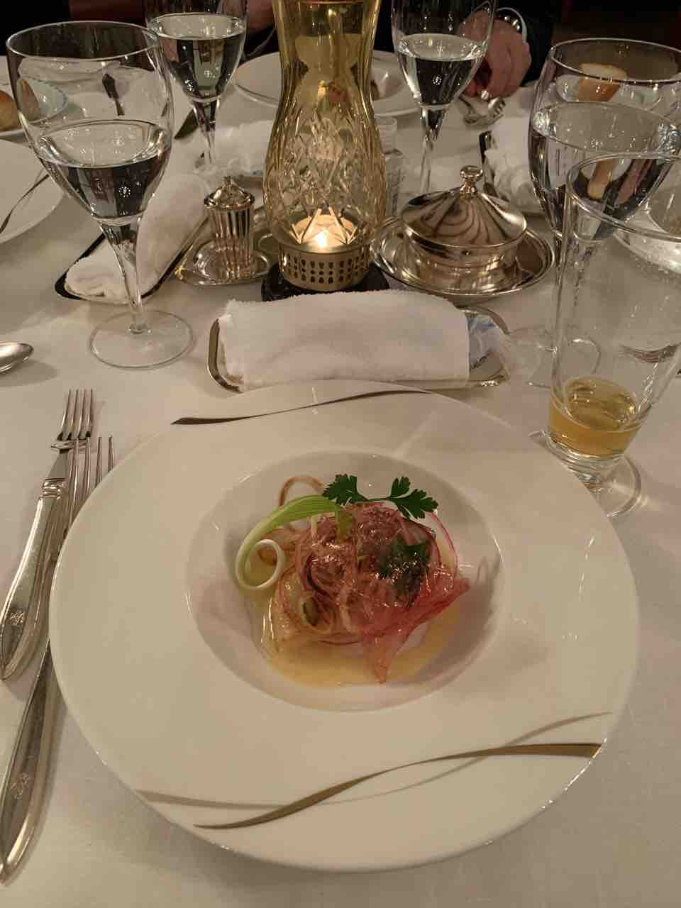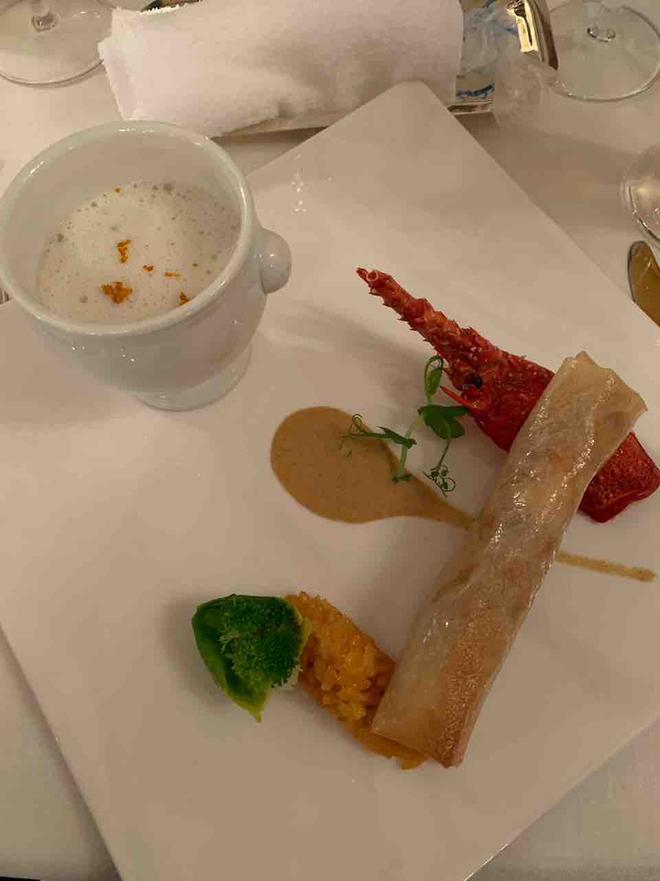 根セロリのなめらかなスープが泡立てられて供され、やさしい味わいにうっとりしました。それに対して、パートブリック(チュニジア由来の薄い春巻きのような皮)で包まれた伊勢海老は、パリパリとした食感の中に濃厚な風味があり、合わせて食べると幸せな気分になりました。