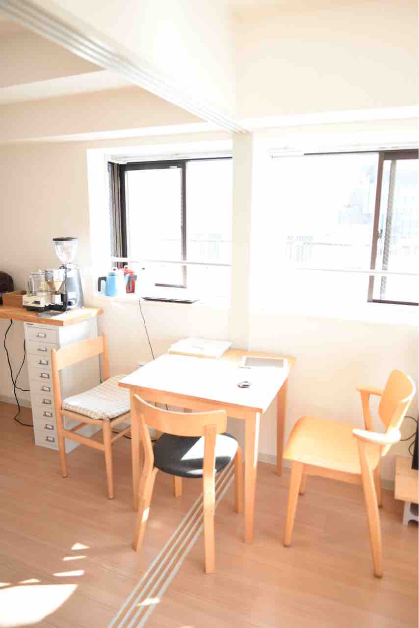 ダイニングテーブルは、キッチンとリビングのちょうど境目の窓際にしました。窓辺は出窓になっているから、そのスペースにPCやカメラを置けてすごく便利です。←散らかる原因。椅子3脚置いても余裕の広さが泣けてきました。