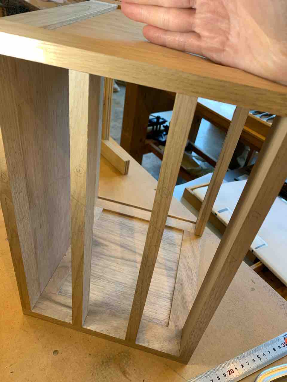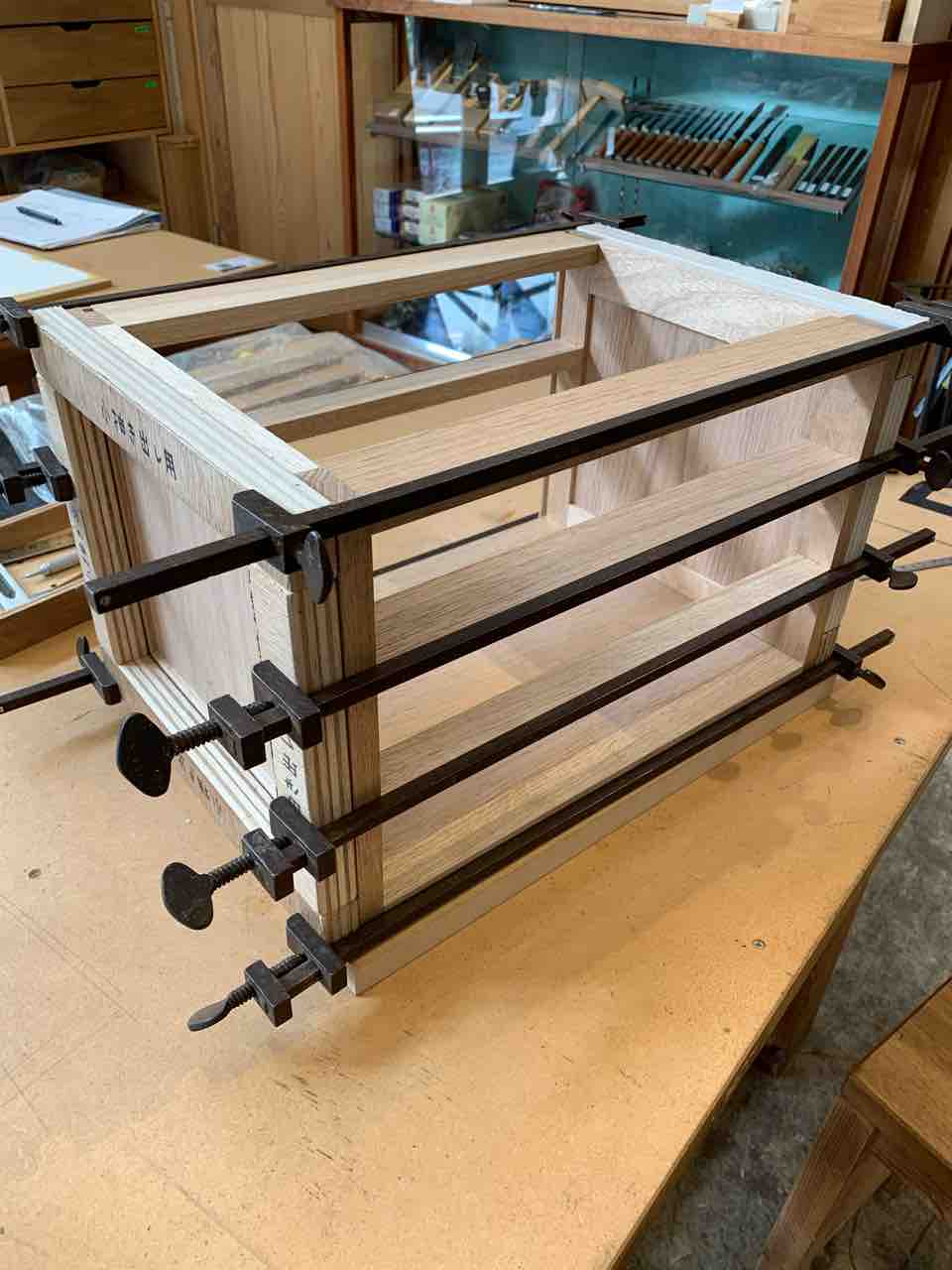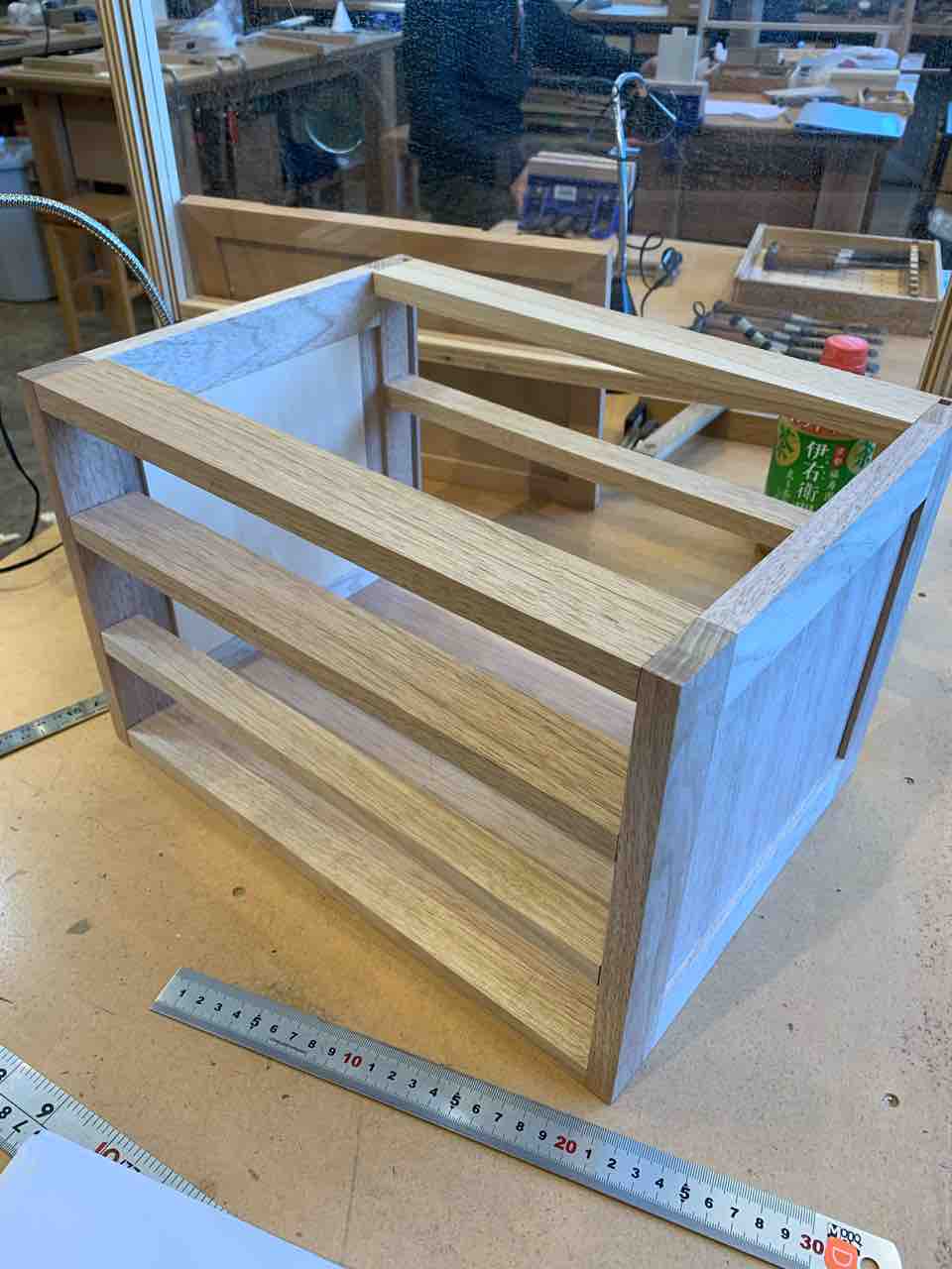 框(かまち)組みした側板、上桟、裏上桟、棚口上段、棚口中段、地板(下桟、裏下桟)を組上げました。やっと小抽き出しの外観が姿を現しました。