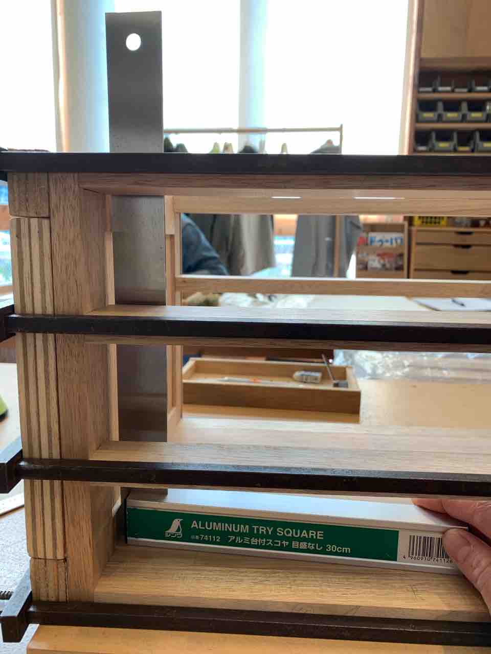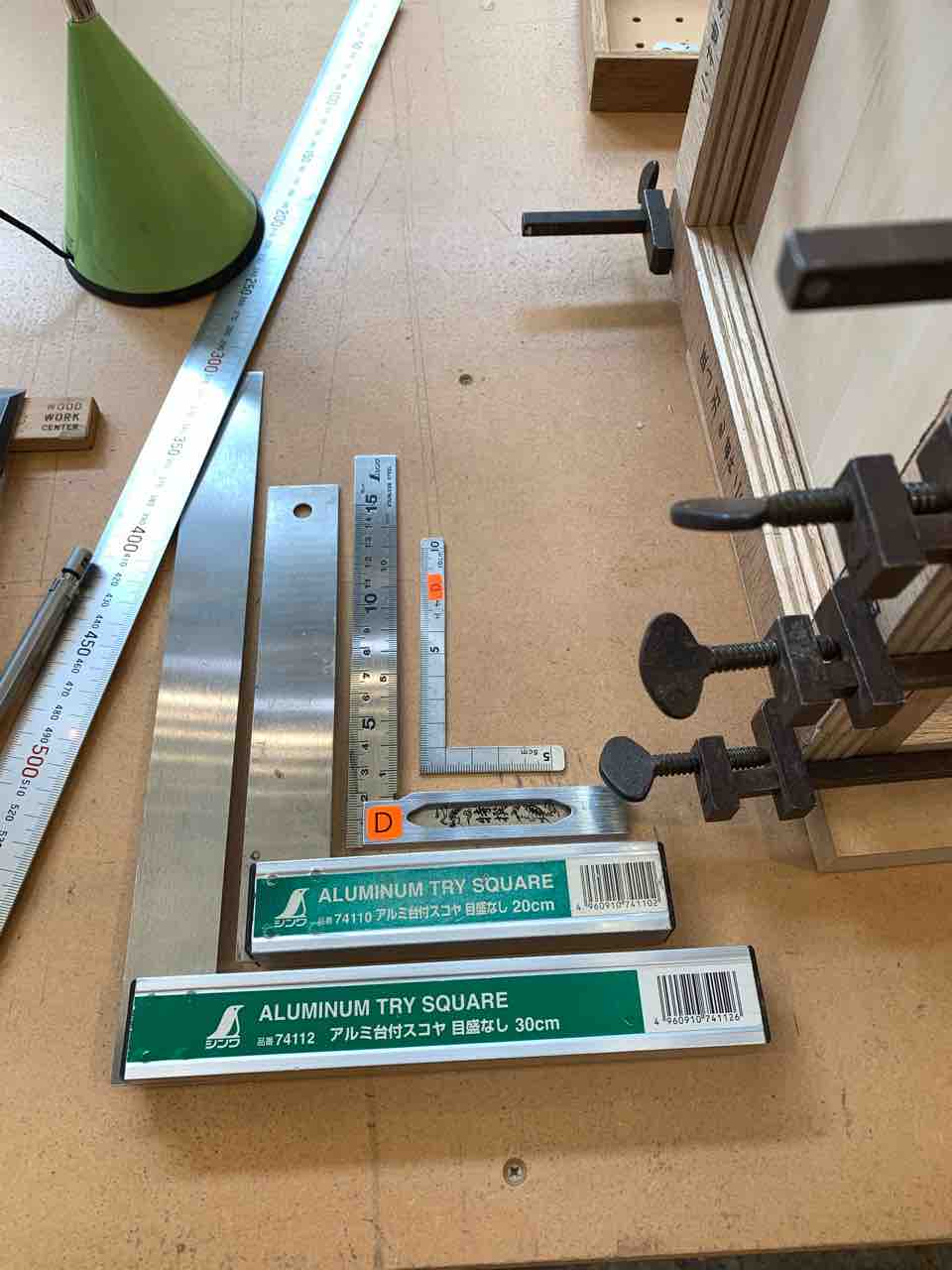 ちなみに、カネの確認や、材料に垂直な線を引く際には「スコヤ」という器具を使います。サイズ色々あってすごく便利なものです。(注:写真の一番小さなものは三寸法師という曲尺(かねじゃく)で、スコヤではありません。)