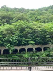 箱根湯本にある青々とした木々からのぞく函嶺洞門(かんれいどうもん)。この近くの「函嶺洞門駐車場」は無料です。