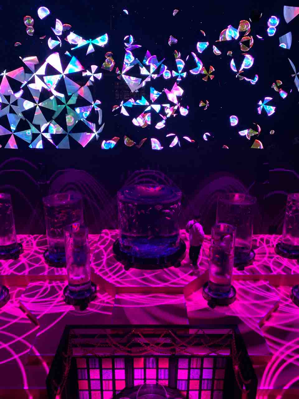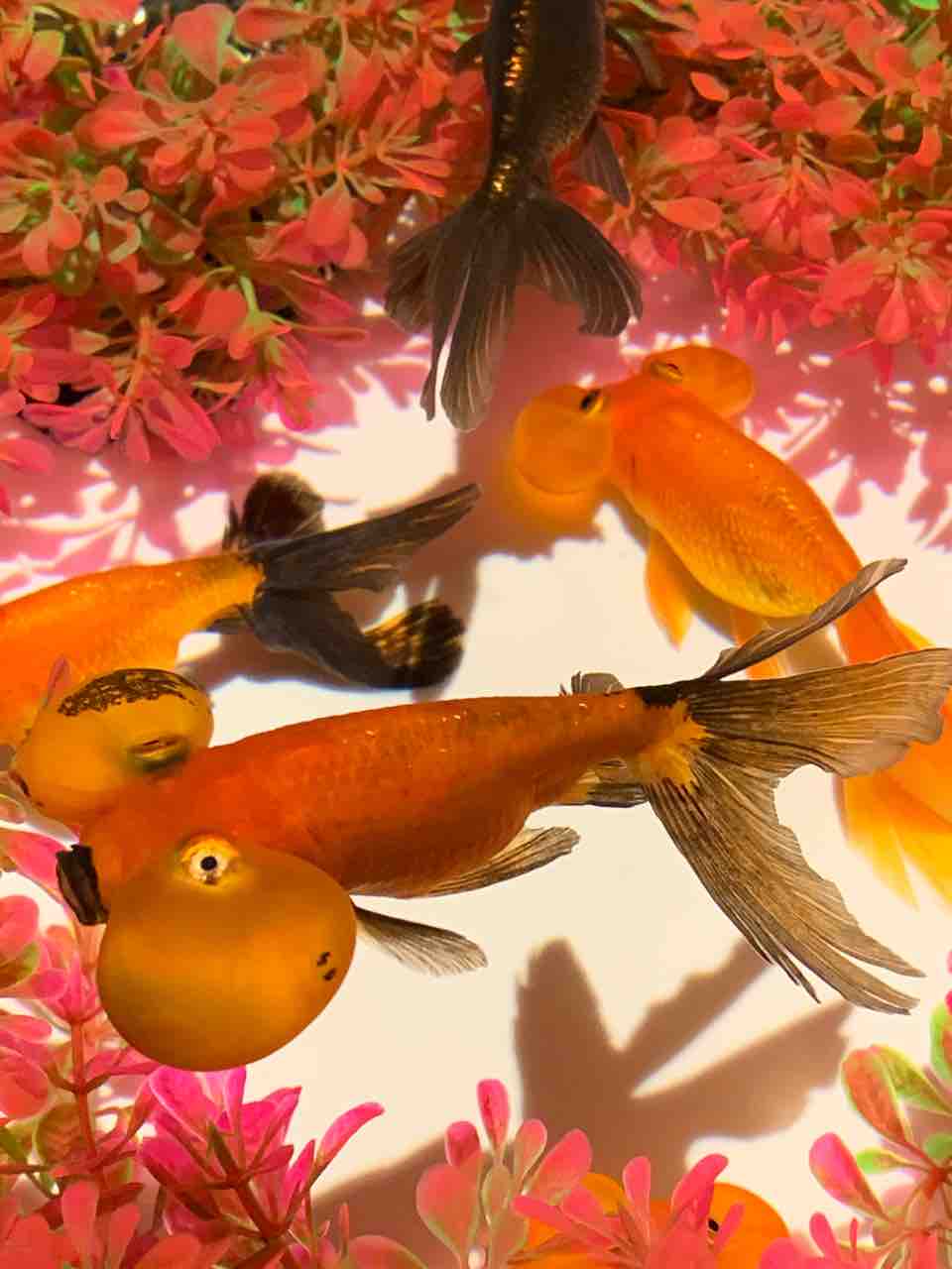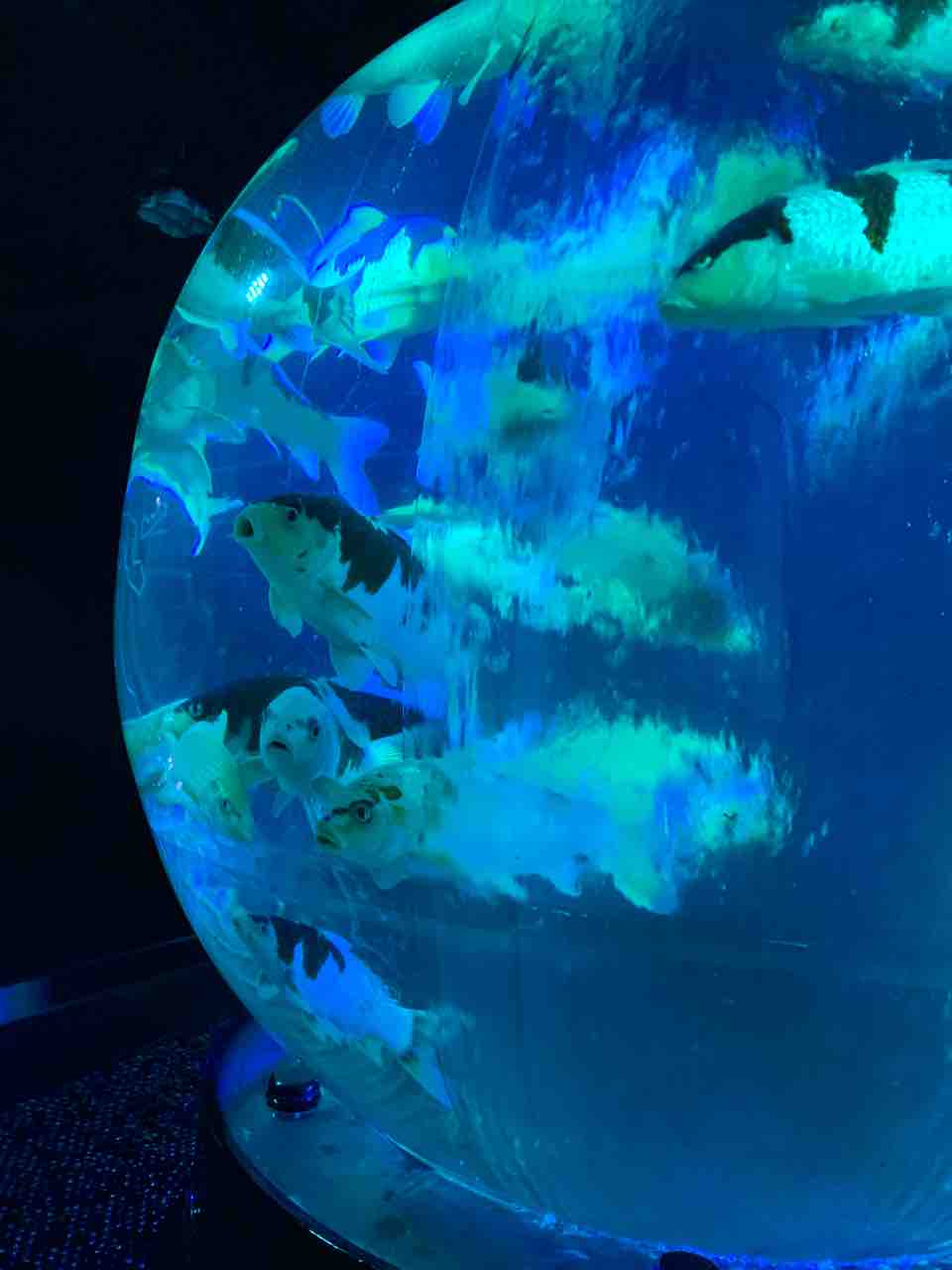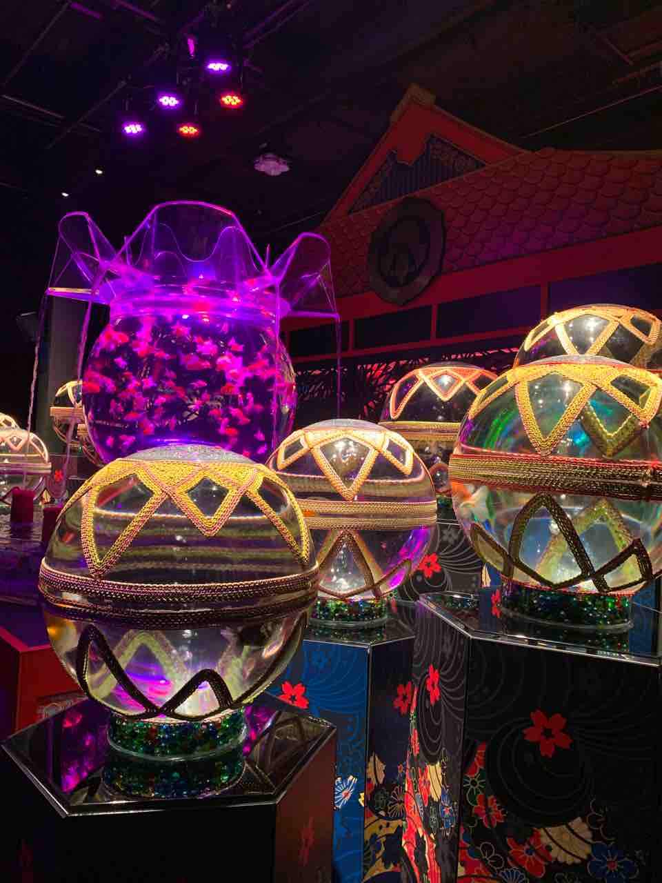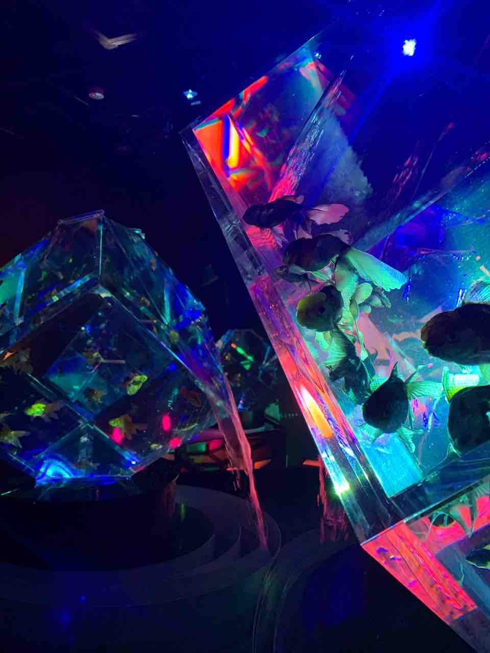 金魚が様々な形の水槽に入れられ、ライトを浴びて異次元でした。