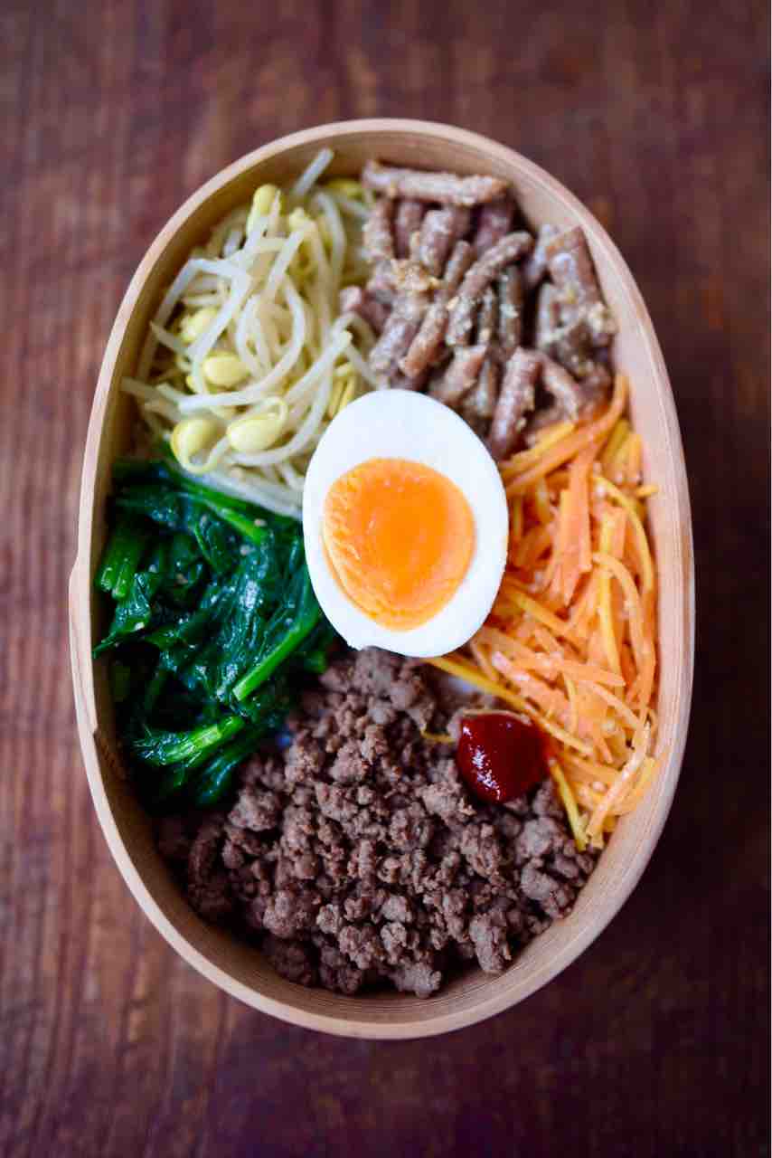 ほうれん草、人参、豆もやし、わらび水煮 でナムルを作り、牛挽肉を炒めてビビンバ弁当を作りました。息子のです。