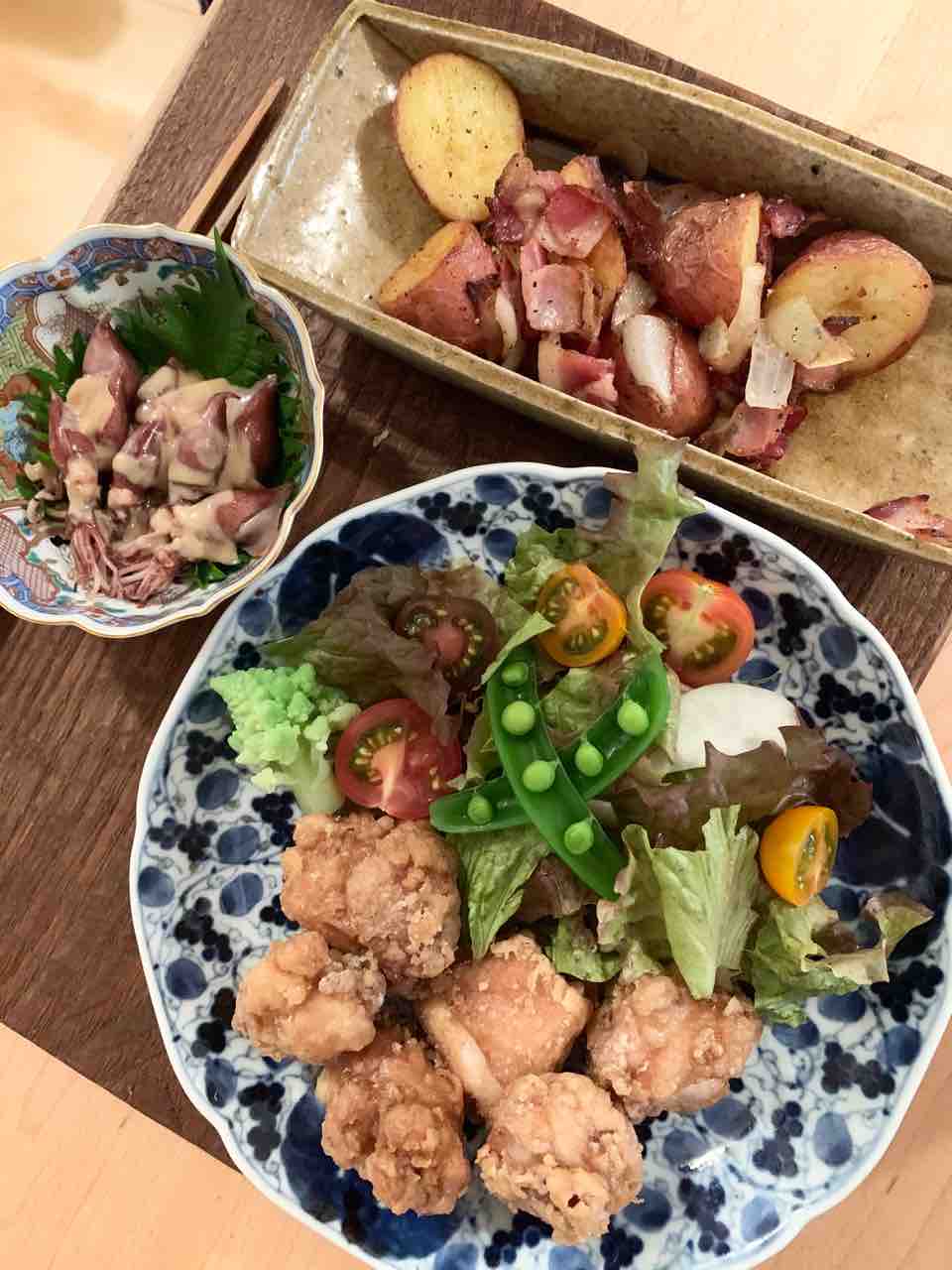 鶏胸肉は唐揚げにして、サラダ、コールラビ、スナップエンドウ、ミニトマト のサラダを添えました。