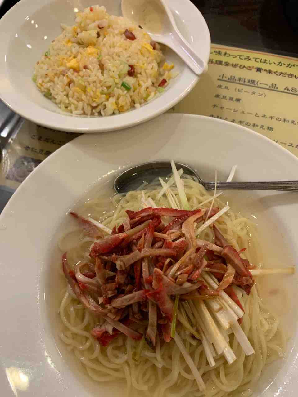 よく行く「海南飯店」で、汁なしネギそばと半チャーハンのランチセットを頼みました。サラダと杏仁豆腐もついて700円って毎度ながら信じられません。
