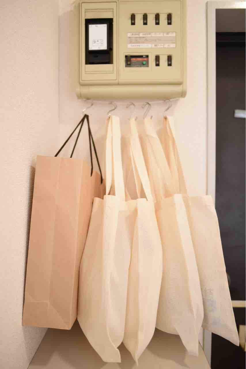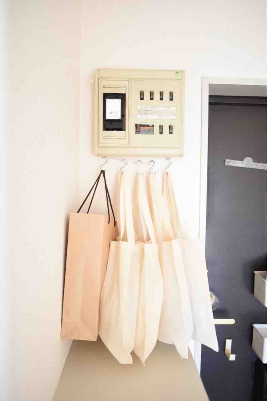 玄関の靴箱の上方にブレーカーボックスがあるので、それに紐をぐるりと回し、S字フックを付けてバッグをぶら下げました。S字フックは手持ちのものを使い回しました。