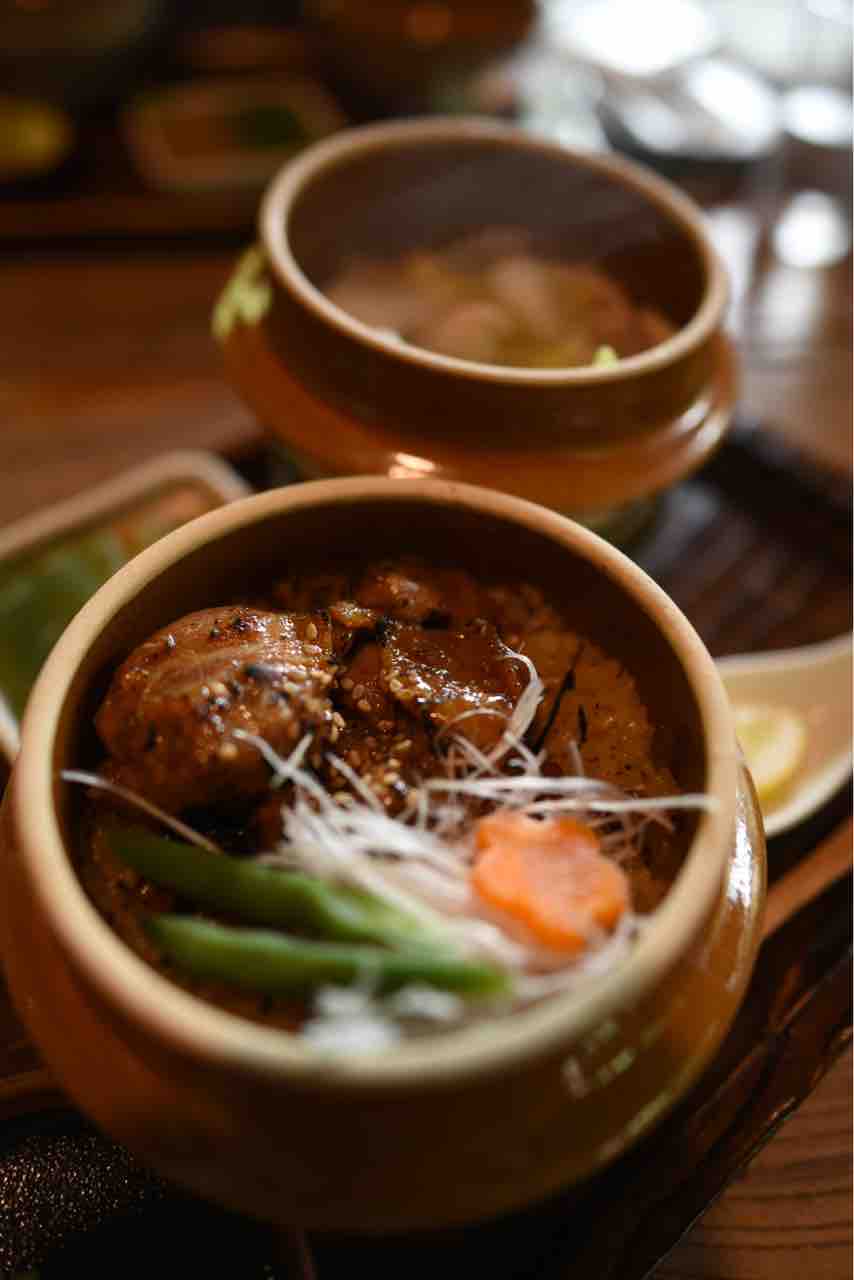 2つの釜のひとつには具だくさんの鶏ごぼう釜めし、もうひとつには水炊きが入っていました。それ以外にも刺身こんにゃく、お新香、小さな抹茶プリン が並んでいました。