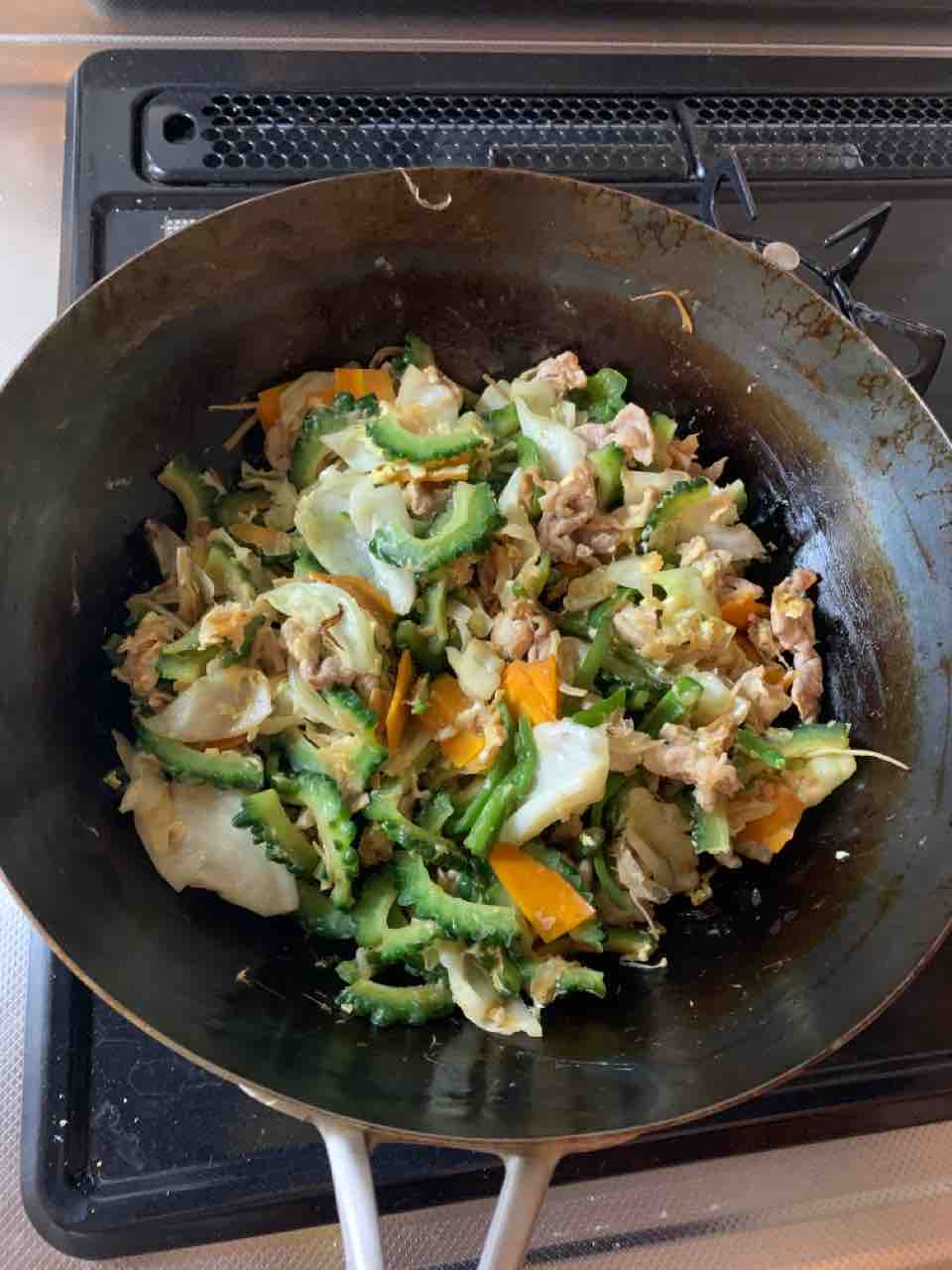 ゴーヤーはキャベツ、人参、えのき、ピーマン、豚肉 と炒めてゴーヤーチャンプルーにしました。ゴーヤーの苦みをとるために、塩もみして水で洗い、さらしでぎゅっと絞って使いました。