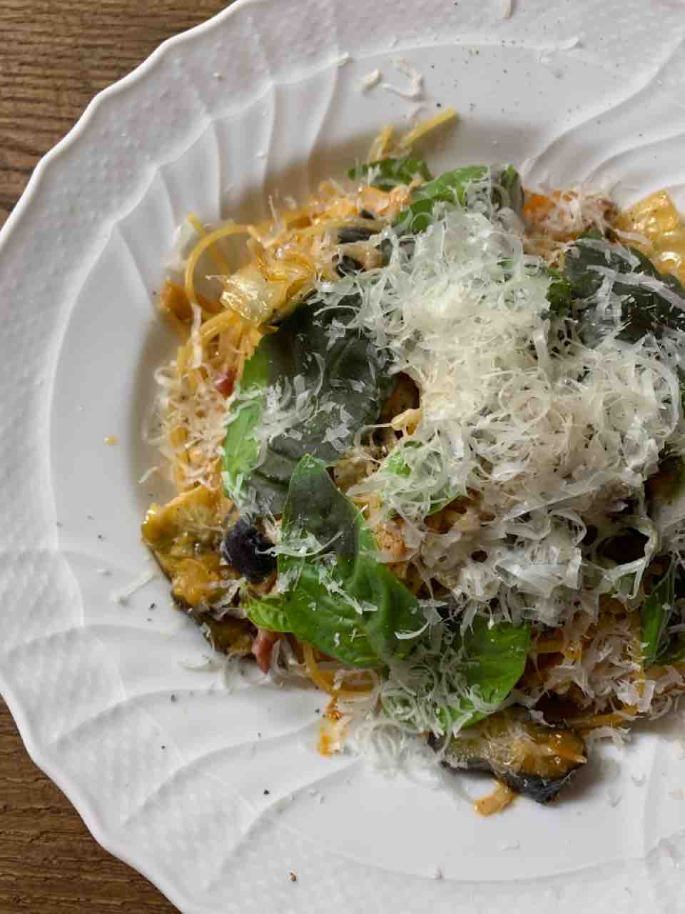 残っていたベーコン、茄子、にんにく、玉ねぎ、えのき、バジル で低糖質パスタも作りました。