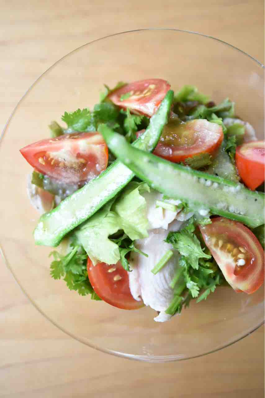 鶏ハム、サニーレタス、パクチー、トマト、オクラ で別種のサラダも作りました。グリーンハバネロソースをふりかけてちょっとだけメキシコ風にしてみました。