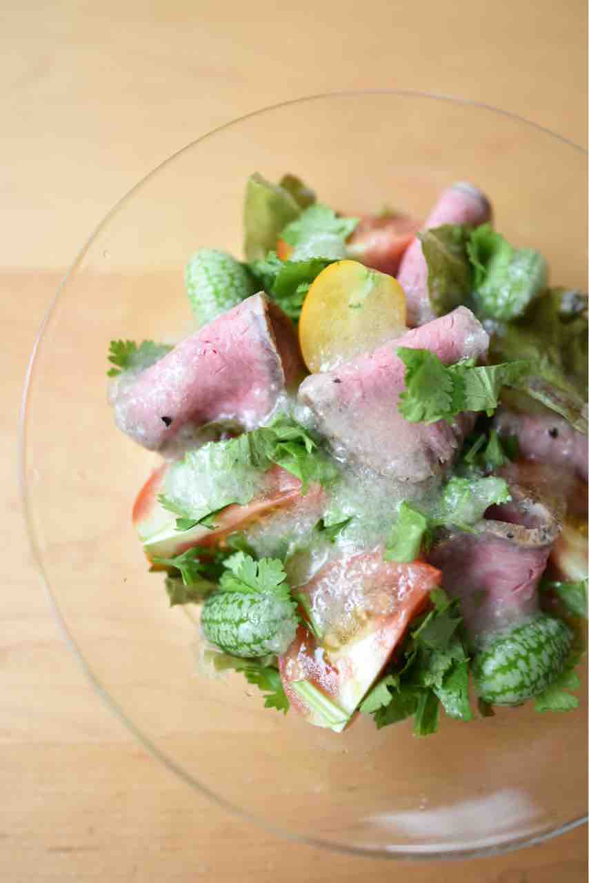 サニーレタス、パクチー、きゅうりメロン、トマト とともにサラダにしました。