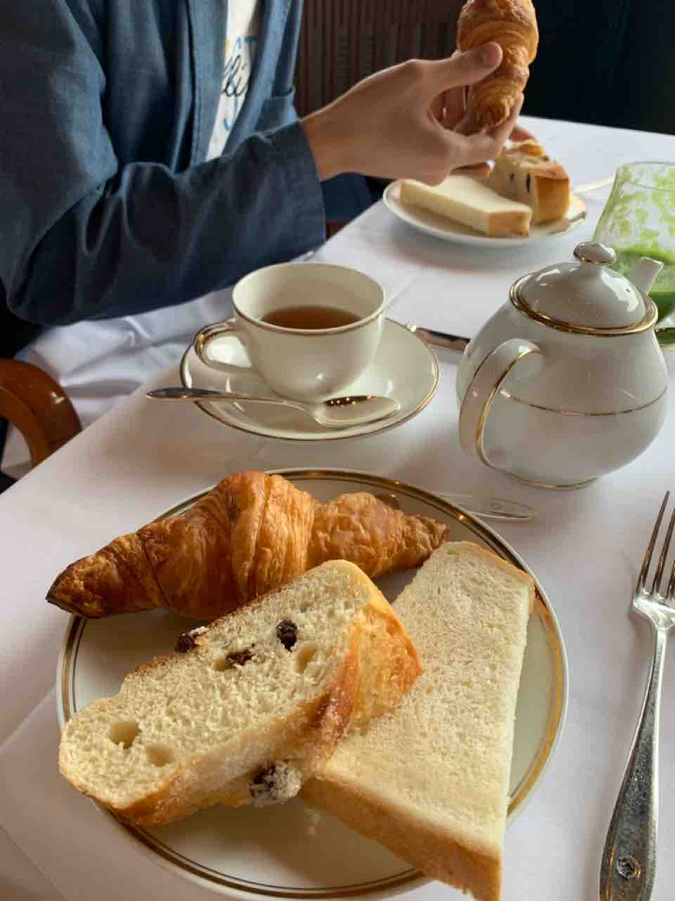 パンはクロワッサン、レーズンパン、食パンの3種類にバターといちごジャムが付いてきました。