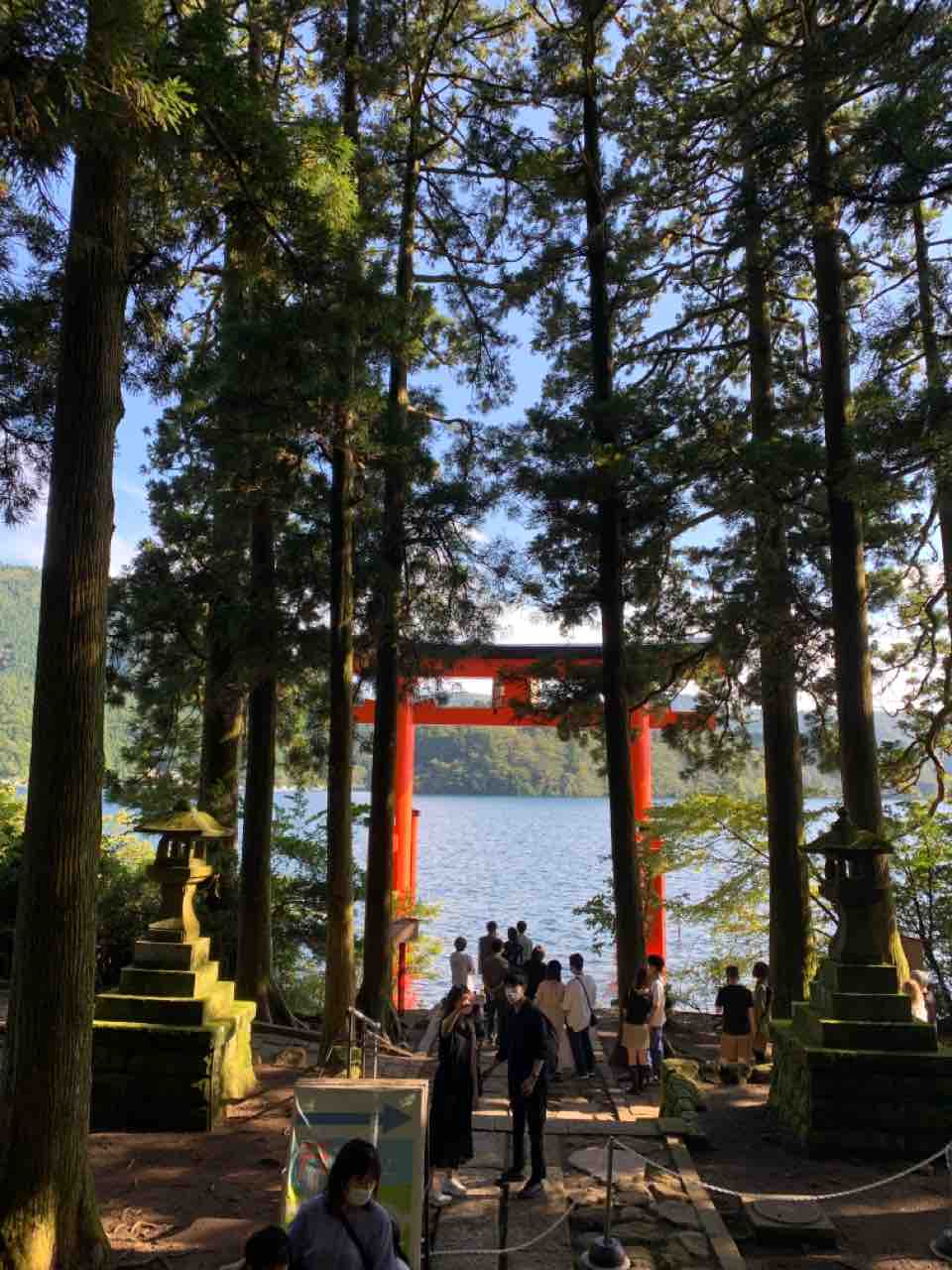 箱根神社の芦ノ湖湖畔にある平和の鳥居は、写真撮影で混雑していました。