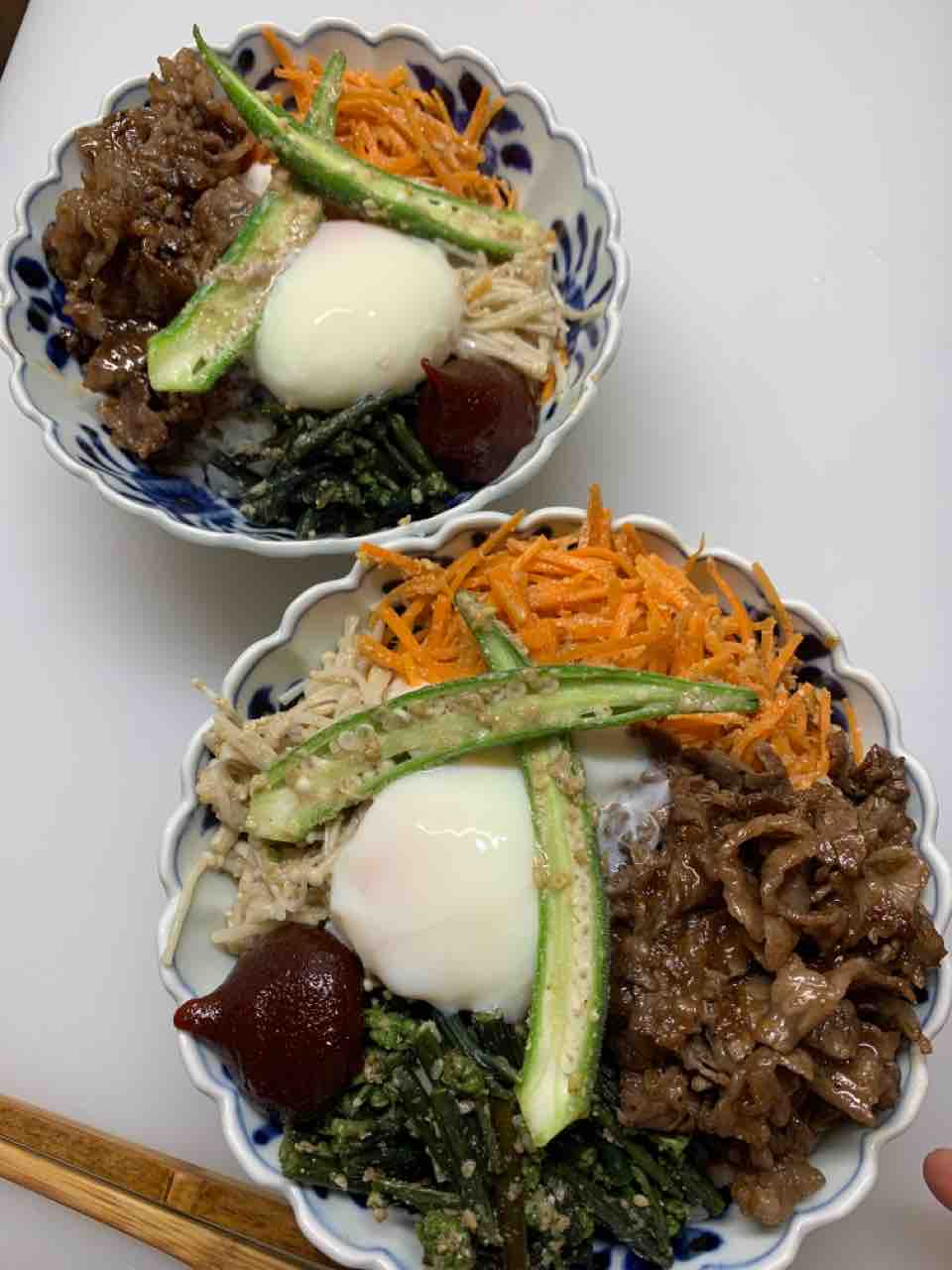春の終わりにわらびを冷凍したのを思い出して、牛肉、にんじん、えのきだけ、オクラとともにビビンバを作りました。上に温度玉子ものせました。