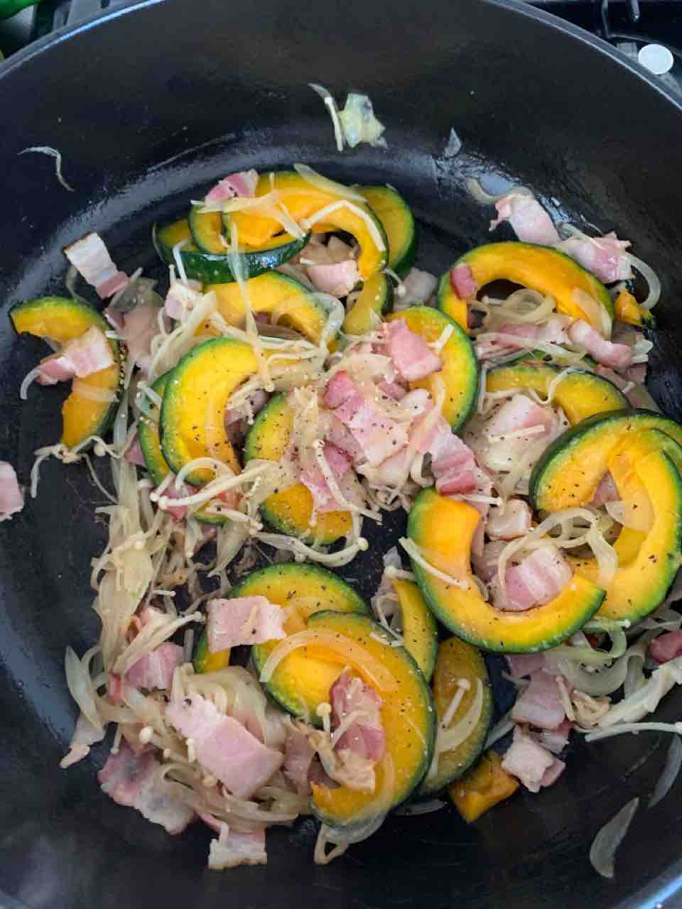 小さな南瓜、玉ねぎ、えのきだけ、ベーコンで炒め物も作りました。ストウブのブレイザーソテーパンで、南瓜をじっくり炒りつけて作りました。
