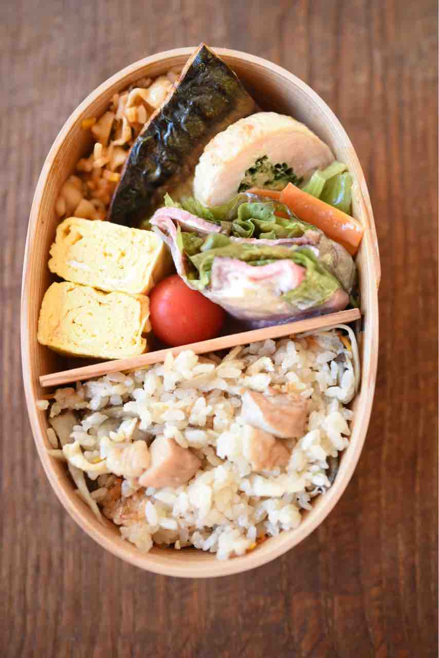 塩鯖、ガランティーヌ、ローストビーフの生春巻き、出汁巻玉子、ミニトマト、五目炊き込みご飯。
