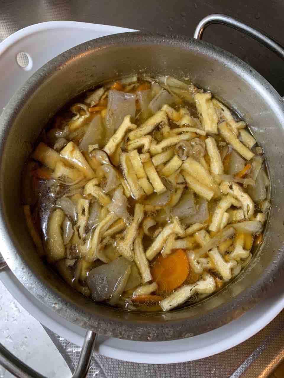 温かい汁物が食べたくなったので、豚汁も作りました。豚汁の中には、豚ばら肉、油揚げ、人参、大根、ごぼう、椎茸、こんにゃく と色々入っているので、一つ一つの材料をどんなに減らしても結局鍋が満杯になってしまってあふれそうになるのがジレンマです。