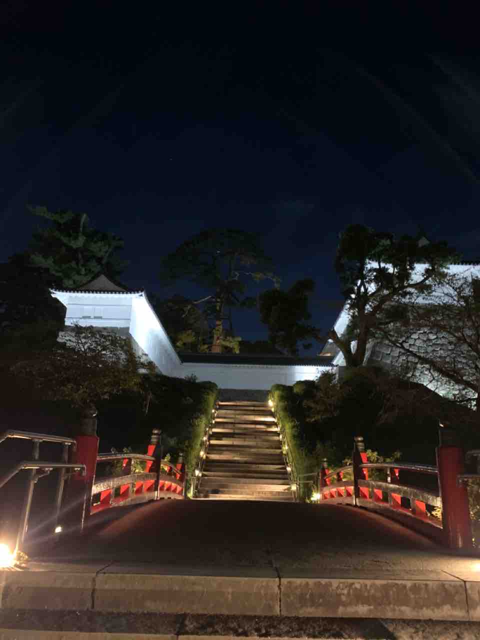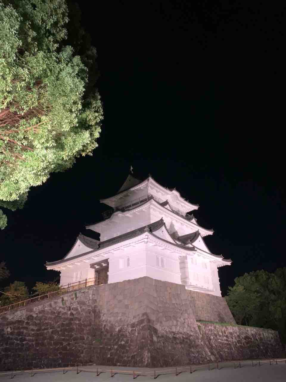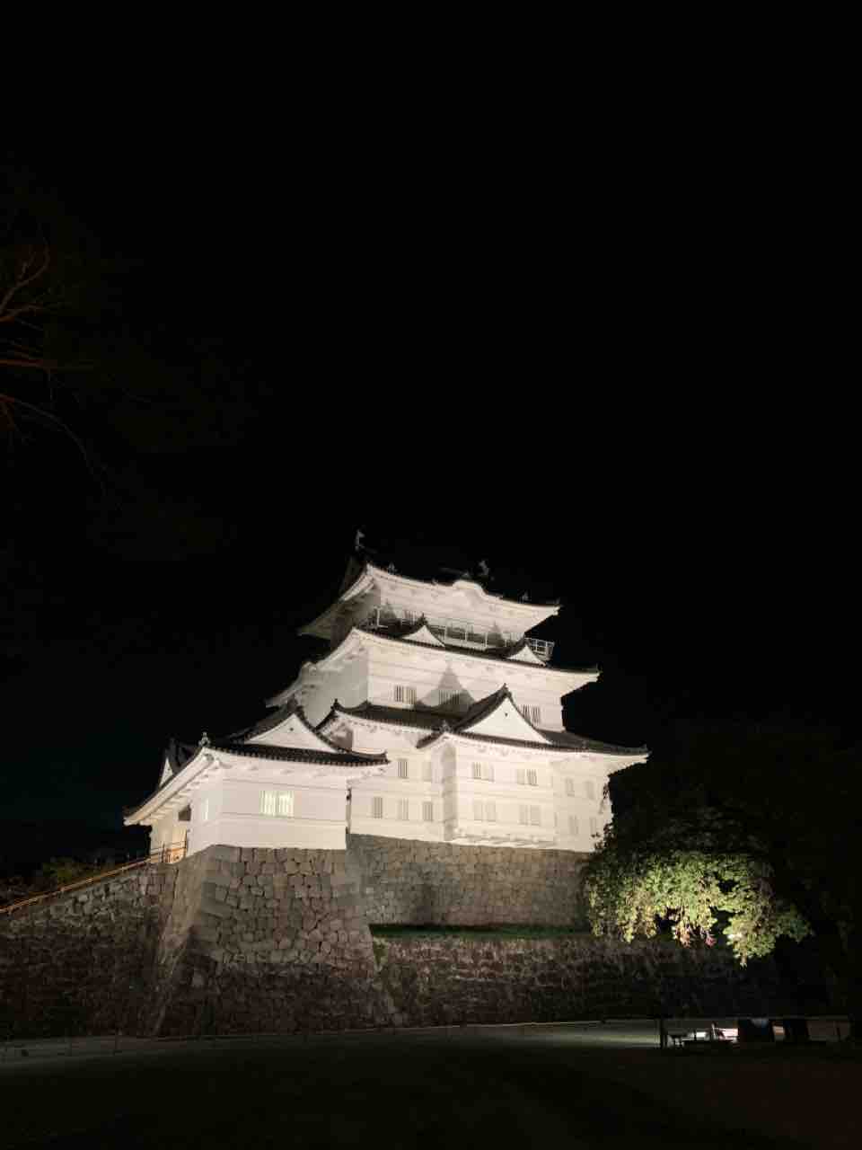夕方になって、段々日が暮れてくると、小田原城が美しくライトアップされていることに気づきました。門は閉じられておらず、天守閣の前まで散策できるようになっていました。