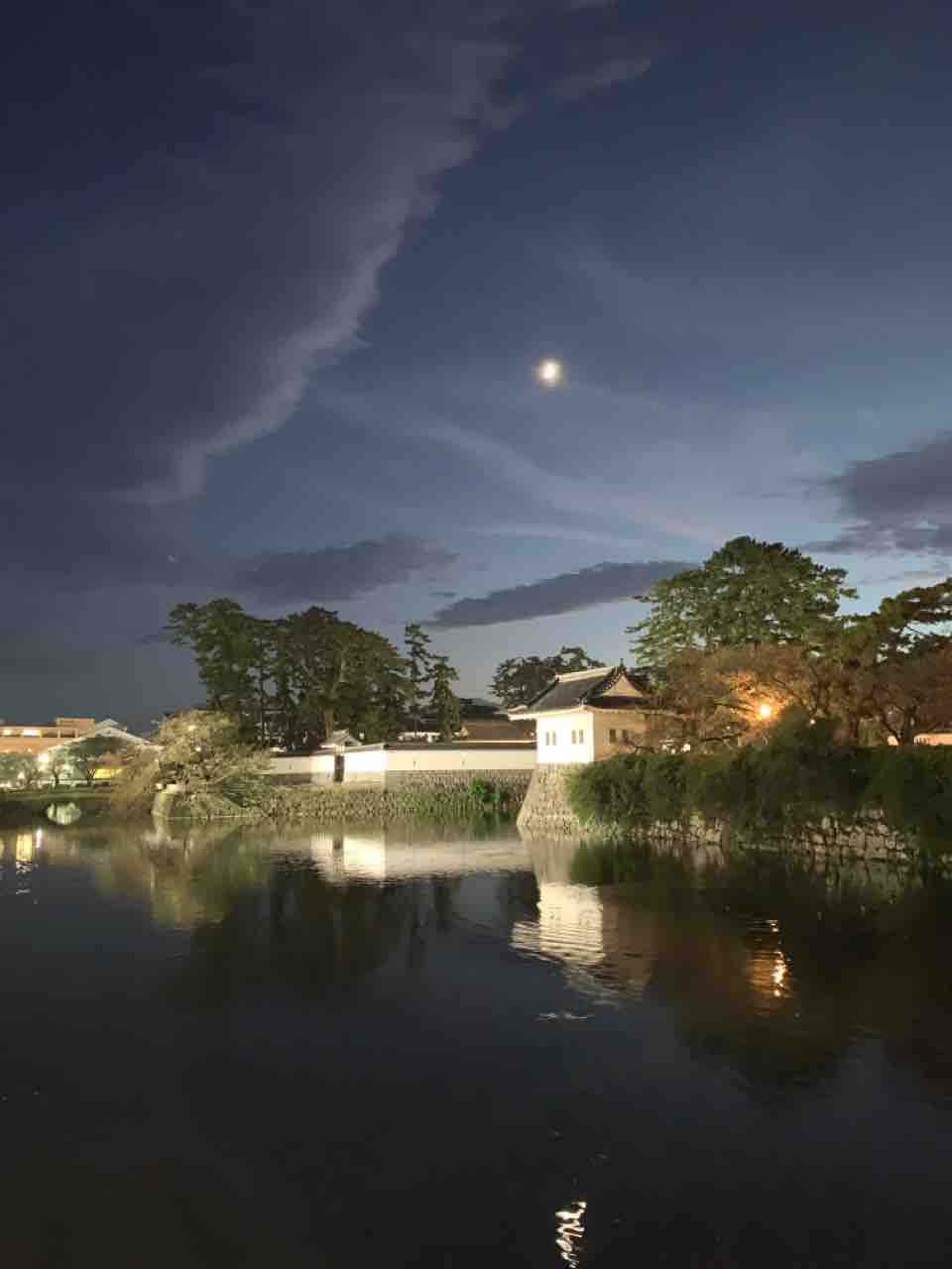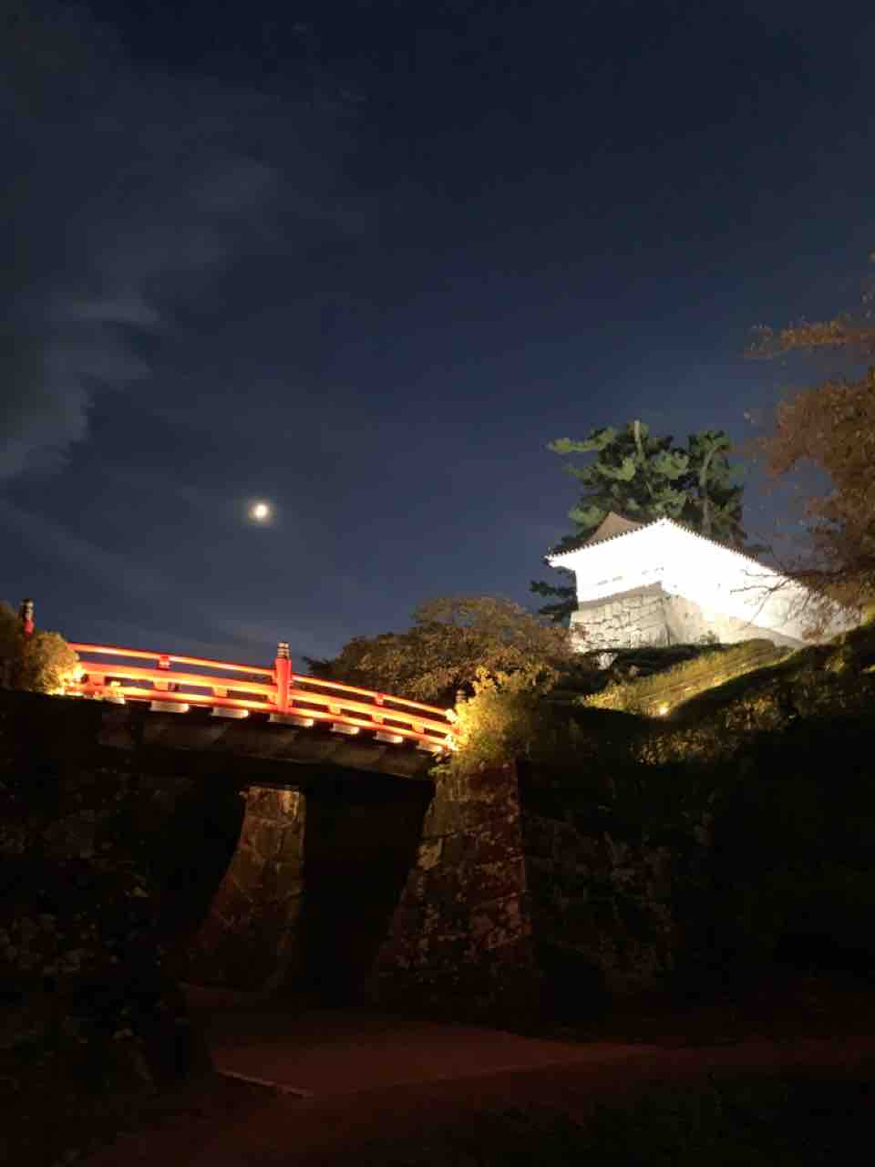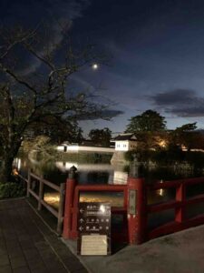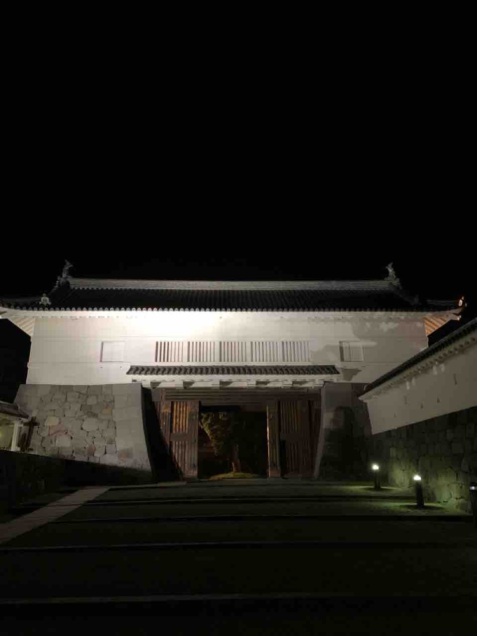 夕方になって、段々日が暮れてくると、小田原城が美しくライトアップされていることに気づきました。門は閉じられておらず、天守閣の前まで散策できるようになっていました。