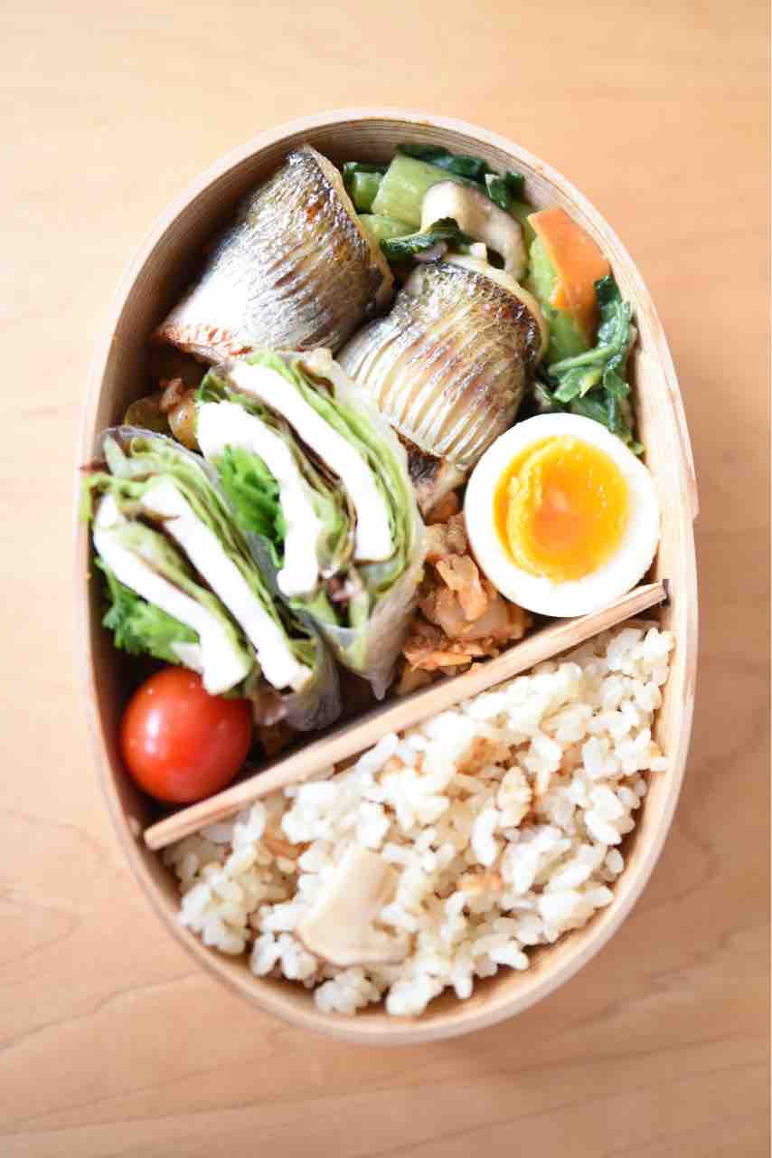 カマスの若狭焼き、鶏ハムの生春巻き、半熟玉子、ミニトマト、肉野菜炒め、トマトパスタ、松茸ご飯 を入れました。