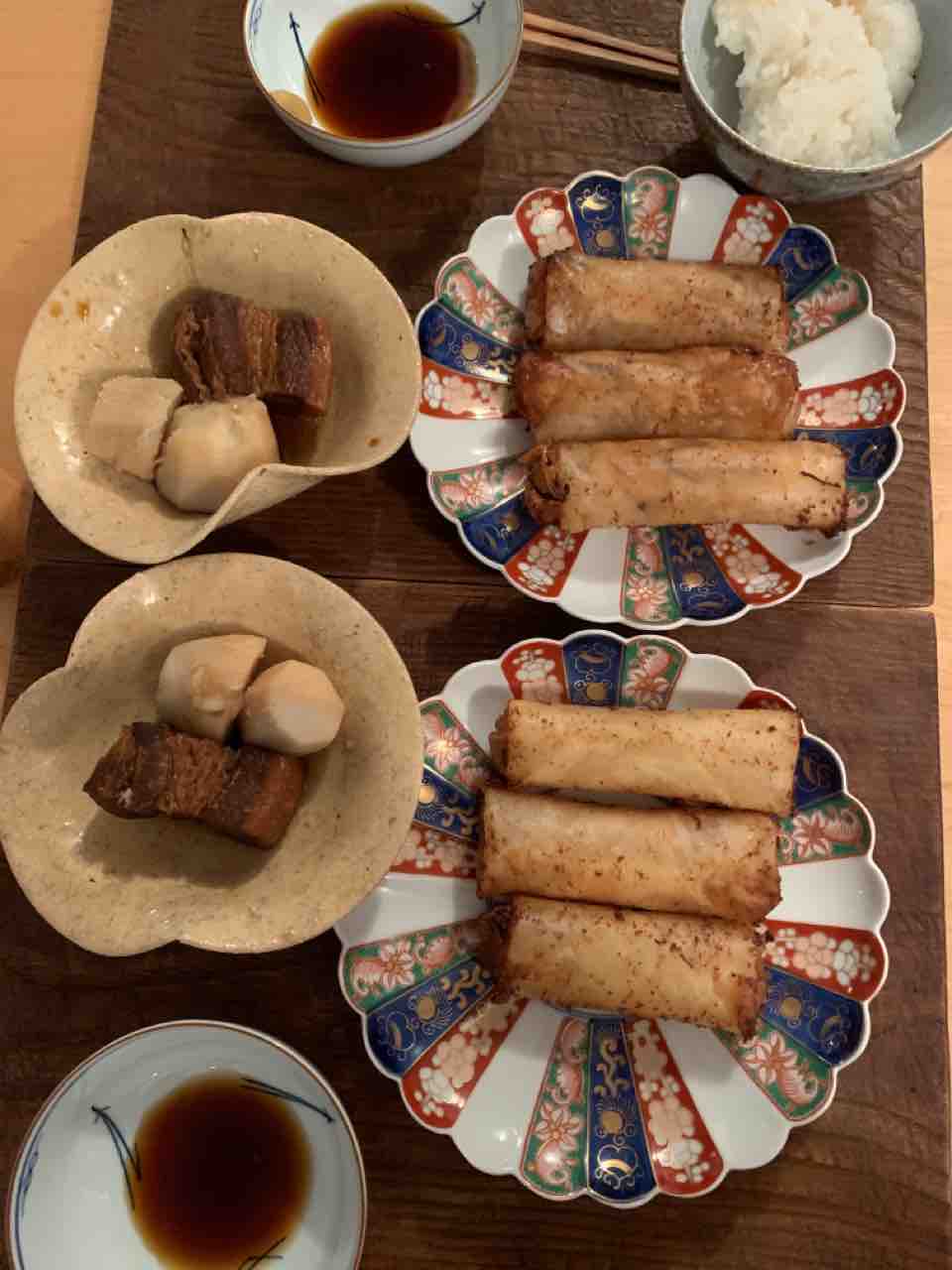 またある日は、筍水煮・海老・椎茸 を炒めて乾燥帆立貝柱の出汁を効かせた餡を作り、春巻きにしました。辛子酢醤油を付けて食べました。