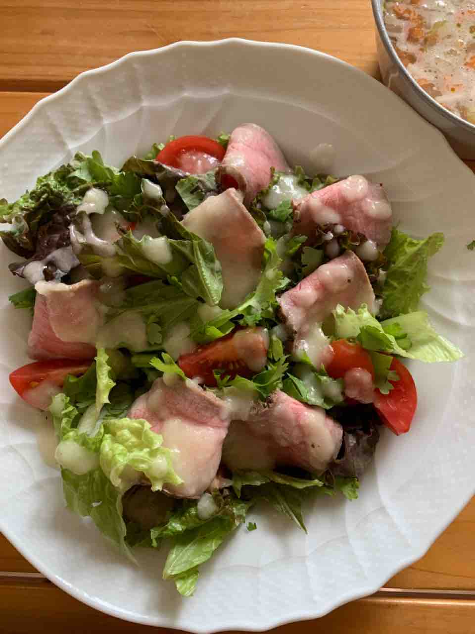 いつものように、低温調理器でローストビーフも作り、サニーレタス、トマト、パクチー とサラダにしました。
