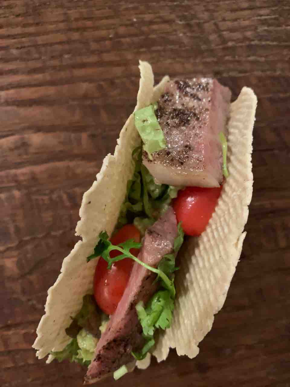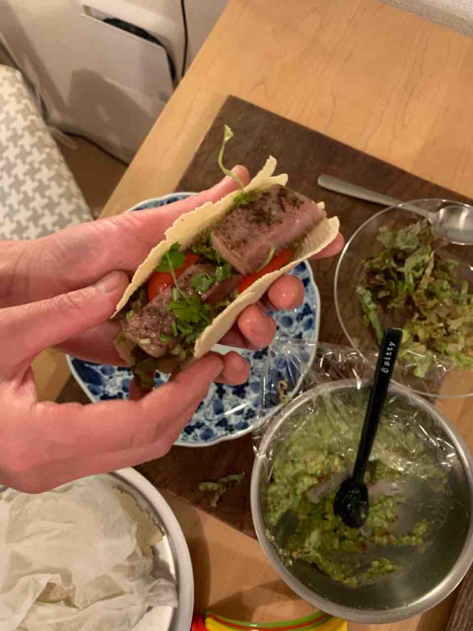 黒毛和牛A5サーロインのステーキを焼いて、刻んだレタス、シラントロ(パクチー)、トマト、ワカモーレとともにトルティージャにのせて食べました。すごくおいしかったです。