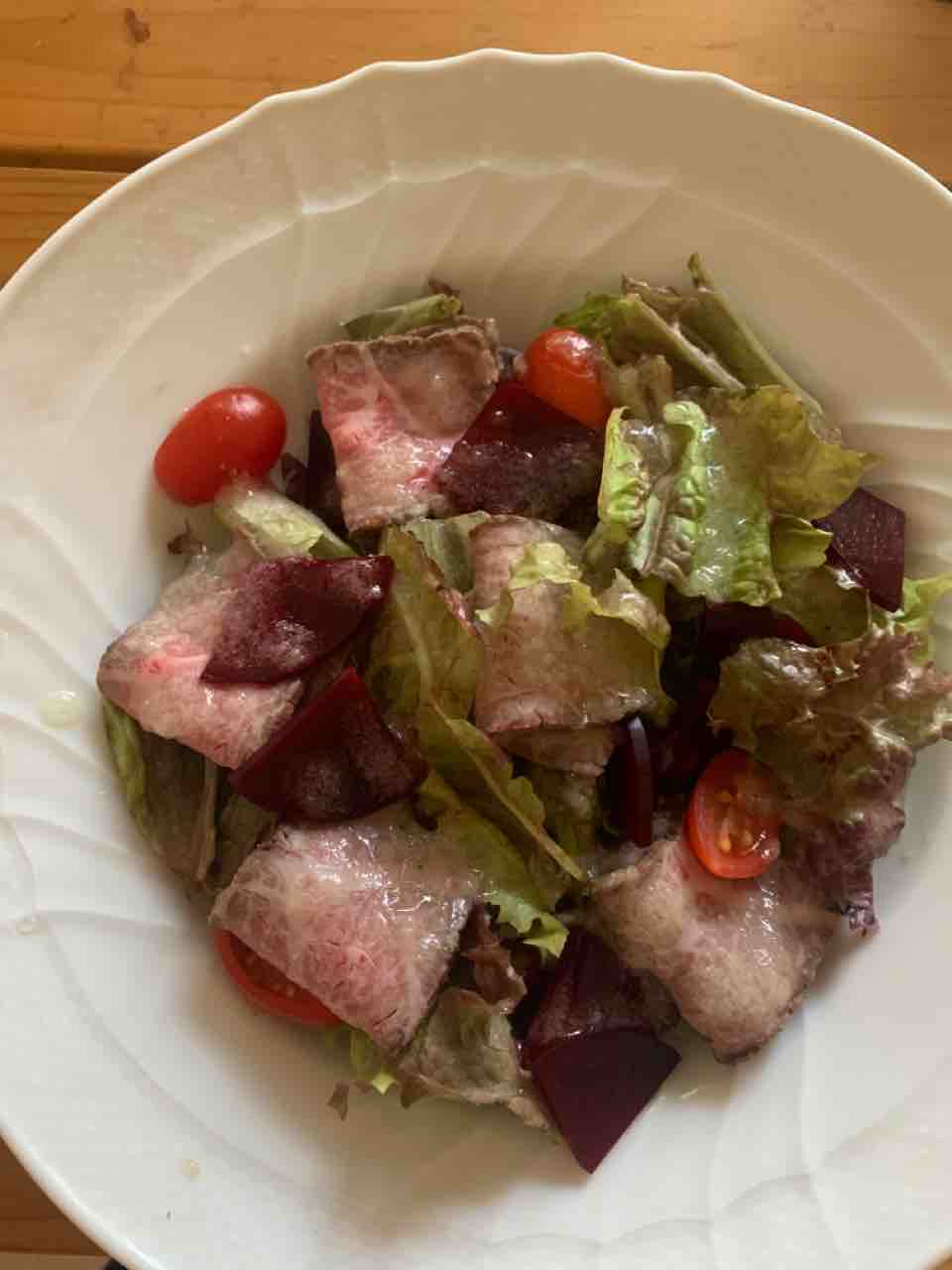 この他、低温調理でローストビーフも作り、サニーレタス、ビーツ、トマト でサラダにしました。