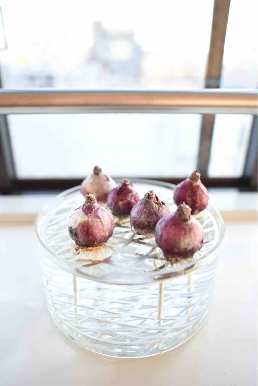 冷蔵庫の中で水をあげて発根を促していたヒヤシンスも、根が出てきたものから順次室温に出し、花器に並べました。白い球根がまだいくつかあってそちらは根の出が良くないのでまだ冷蔵庫内にいます。