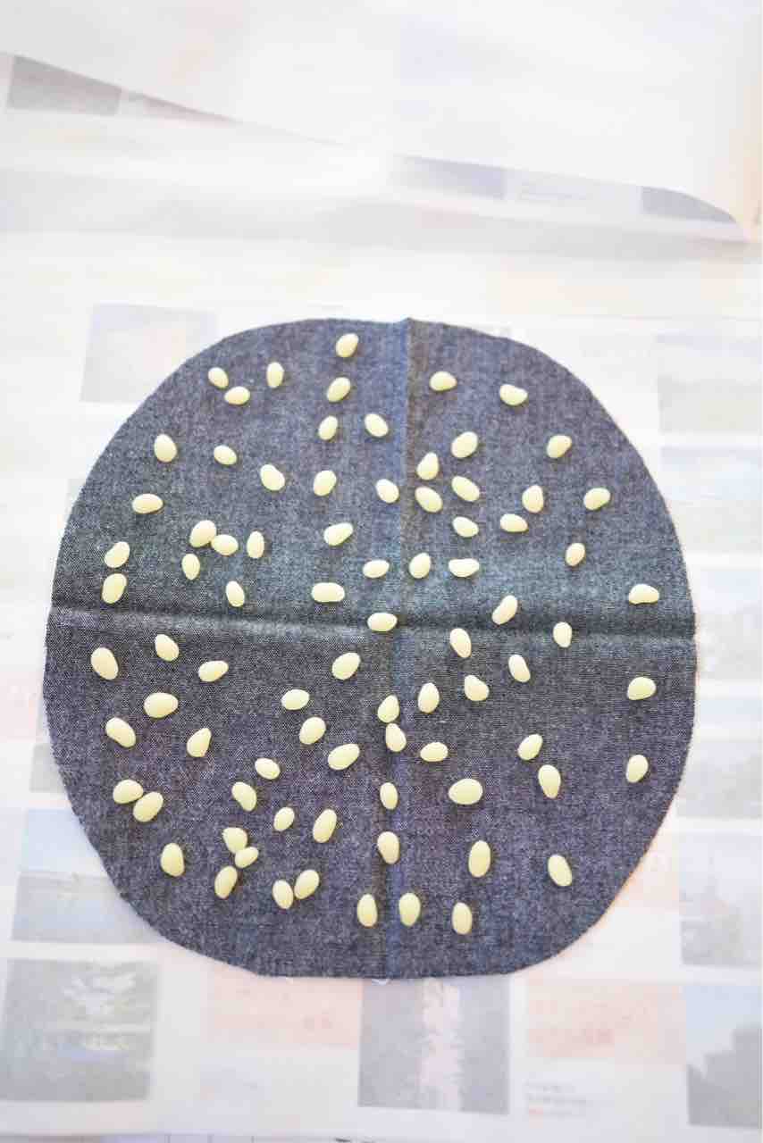 アイロン台の上に新聞紙を敷き、クッキングペーパーを敷き、布を置き、布の上に蜜蝋をまんべんなく配置します。布10cm四方あたり蜜蝋3gが目安ですが、後で調整するので蜜蝋は少しだけ残しておきます。