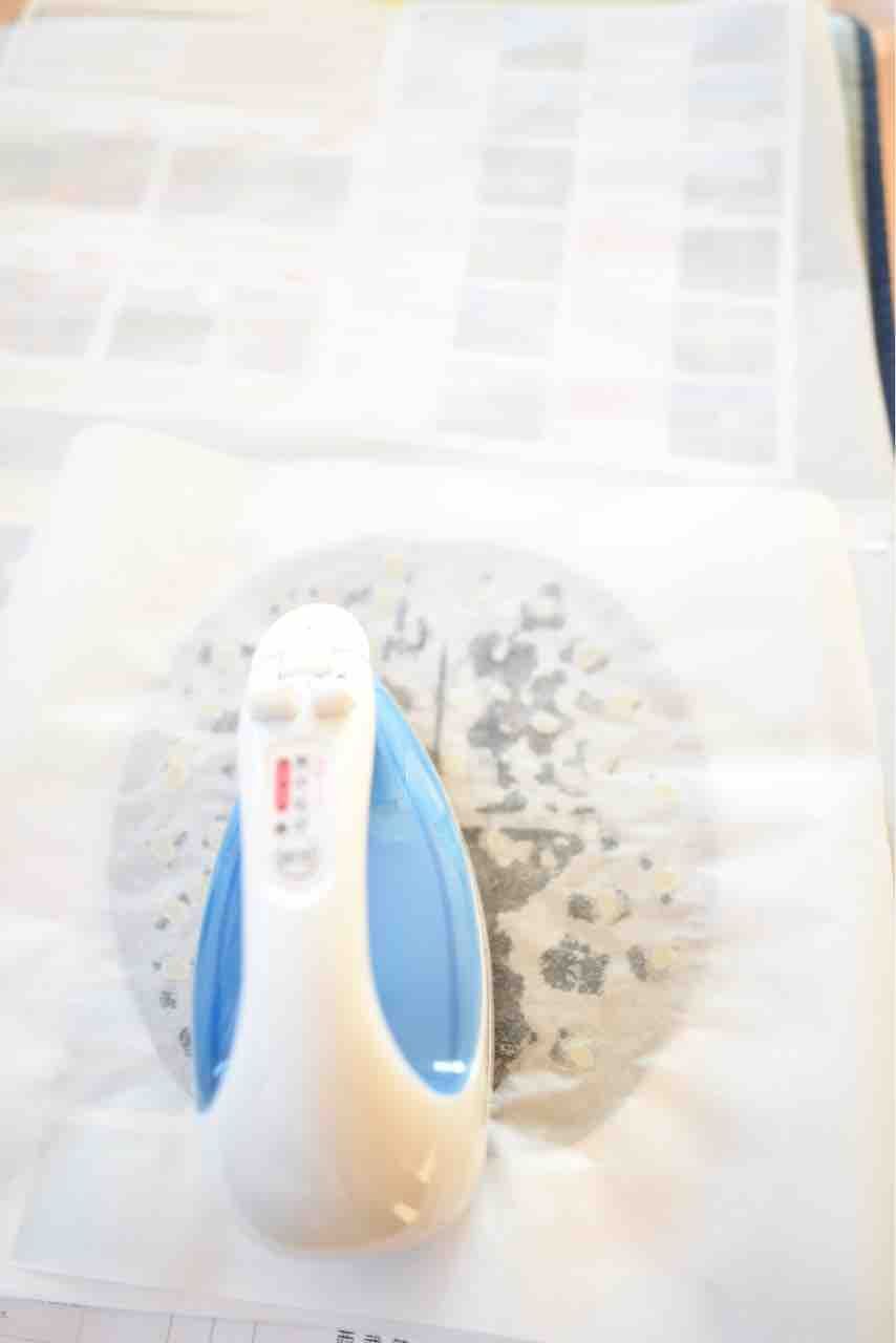 上からさらにクッキングペーパーを当て、低温で予熱したアイロンを当てて蜜蝋を溶かしながら布にしみこませます。