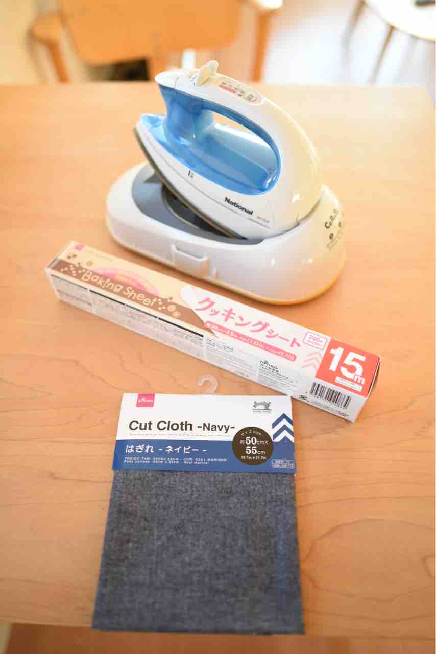 使う道具は、アイロン、アイロン台(またはアイロンマット)、新聞紙、裁ちばさみ、クッキングペーパー。材料は布と蜜蝋です。