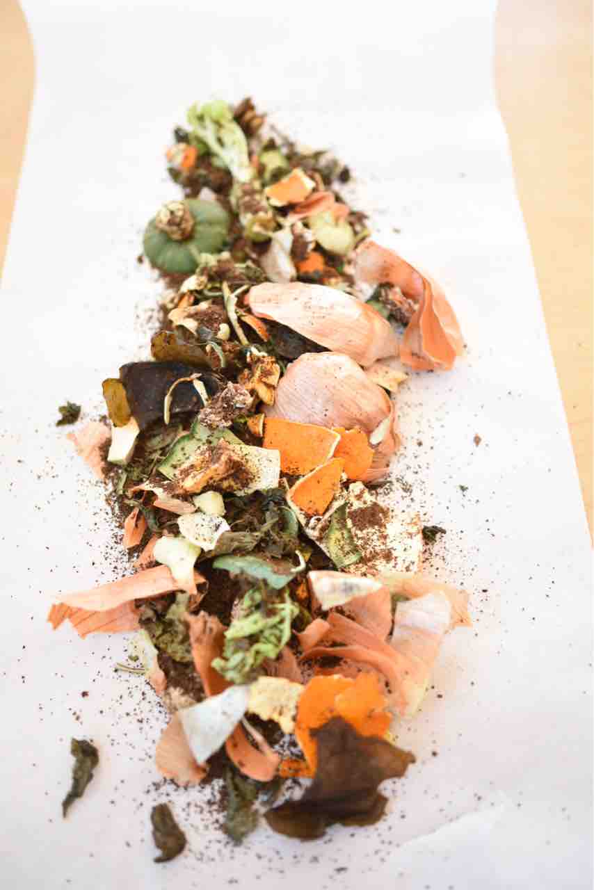 265グラム:コーヒーかす、茶殻、玉ねぎの皮、レタスの芯、南瓜のヘタ、サツマイモのヘタ、ミカンの皮、出し殻の昆布 など