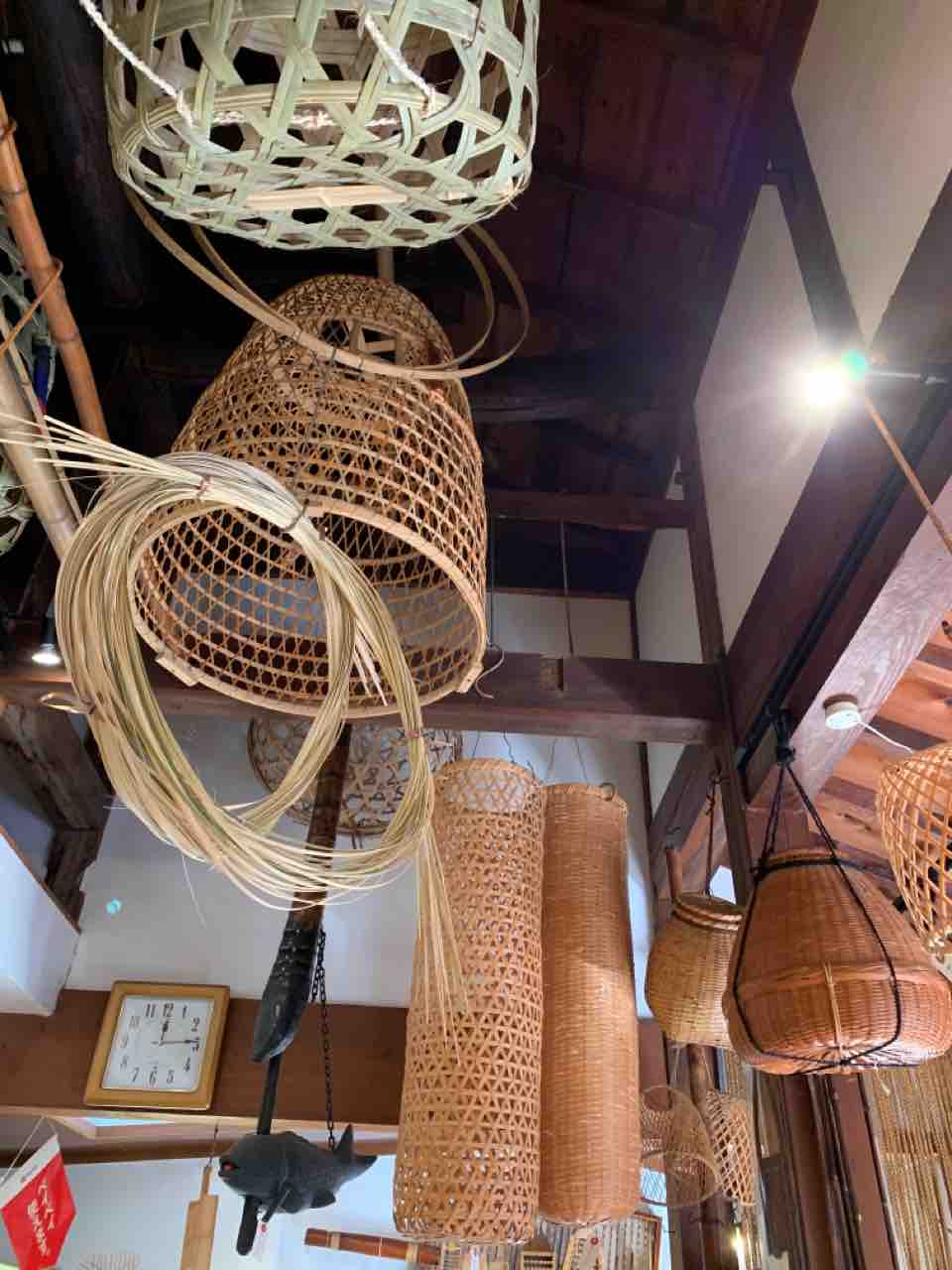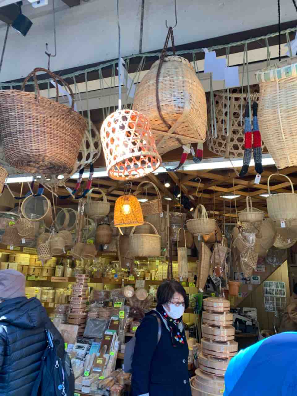 かごバッグもたくさんあるし、かごのランプシェードも素敵だし、それ以外にも木製の調理道具(巻きす、蒸籠、飯台など)も充実していました。