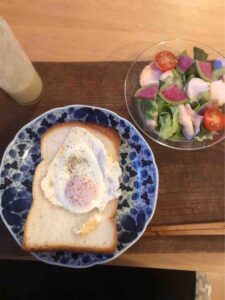 息子は自分で朝食を作ったようです。画像が送られてきました。サラダは前夜に盛っていました。冷凍の食パンをグリルで炙り、目玉焼きを焼いて上にのせたようです。おいしそうでした。