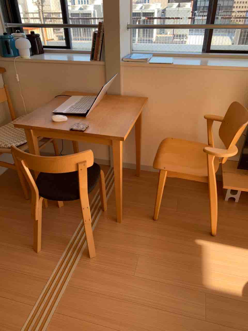 余談ですが、冬の横浜の家は、日中、陽光が部屋の奥まで届きまぶしいくらい明るく暖かくなります。こちらは、東側の窓辺に配置したダイニングテーブルと椅子です。テーブルは木工教室でDIYしました。無垢のメープル材を使いました。ここで食事をしたりPCを付けて作業したりしています。