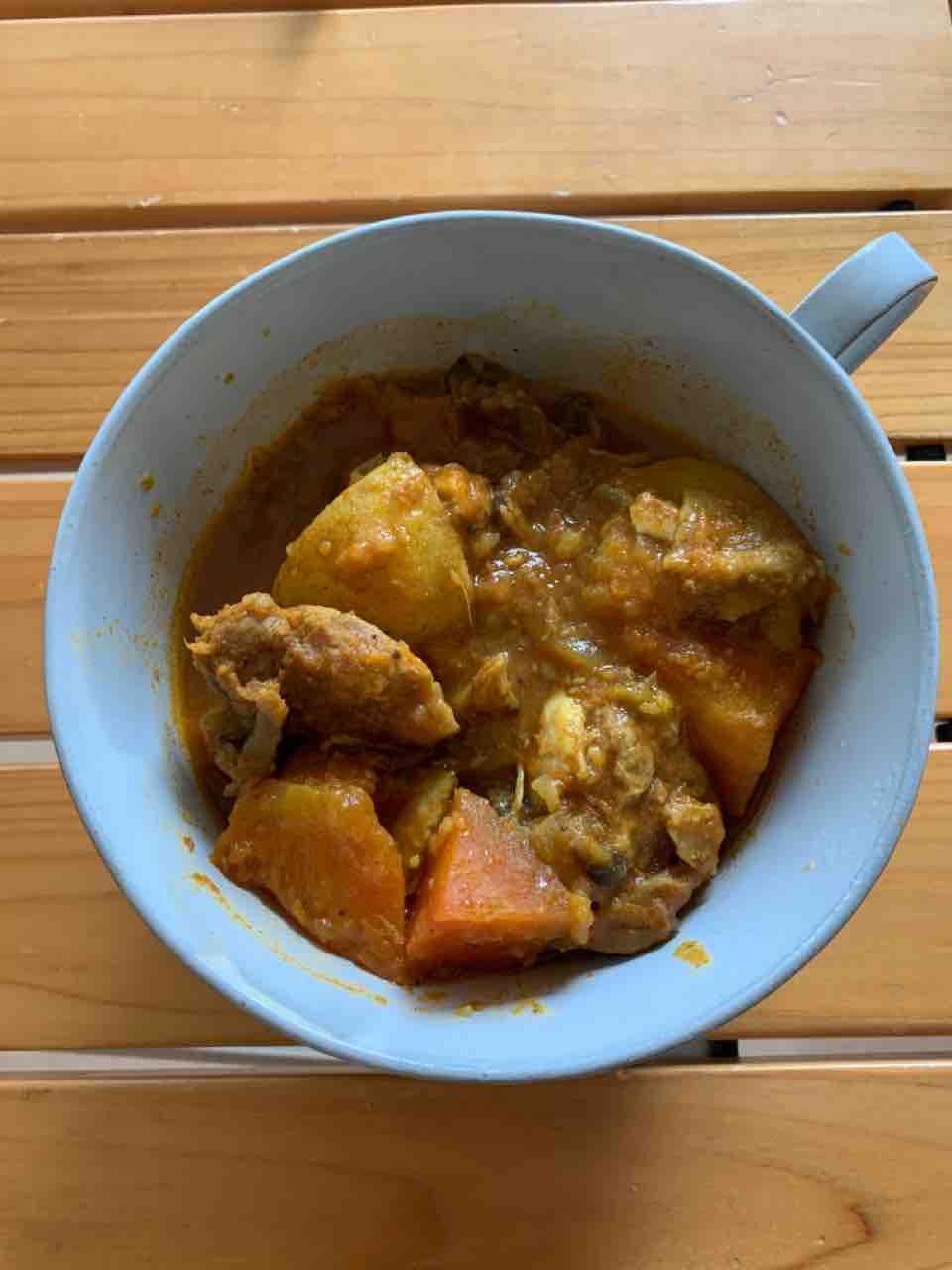鶏もも肉、玉ねぎ、新じゃがいも、人参、ピーマン、ひらたけ でスパイスカレーも作りました。これは電気IH圧力なべを使いました。