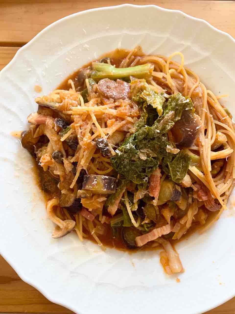 菜の花、ひらたけ、ターサイ、茄子、ベーコン で低糖質トマトパスタも作りました。