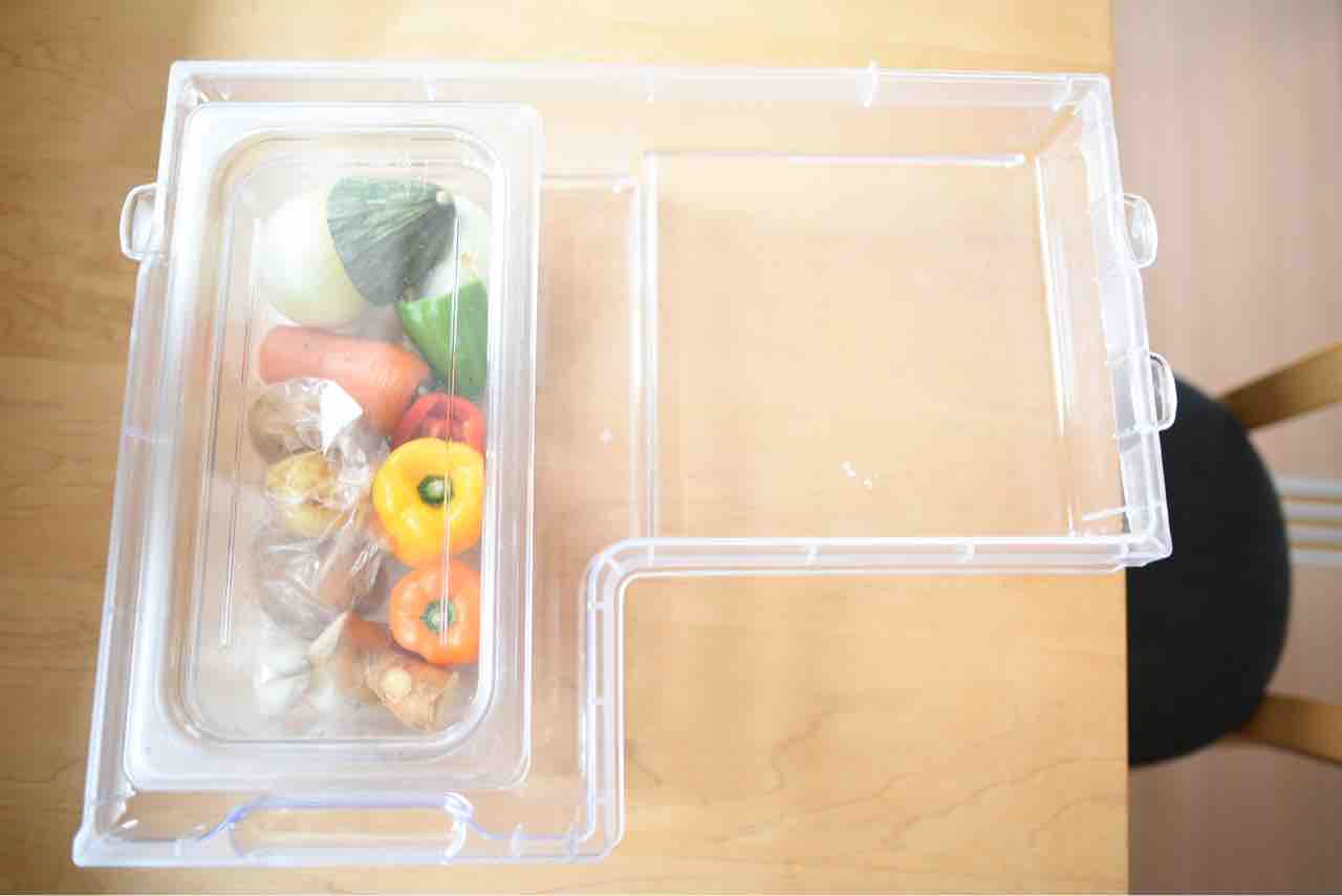 使いかけの野菜は、集めてカレーに入れたり、肉野菜炒めに入れたりと、捨てるところがありません。ふたが透明なこの容器に入れておけば使い忘れて悪くすることを防げます。