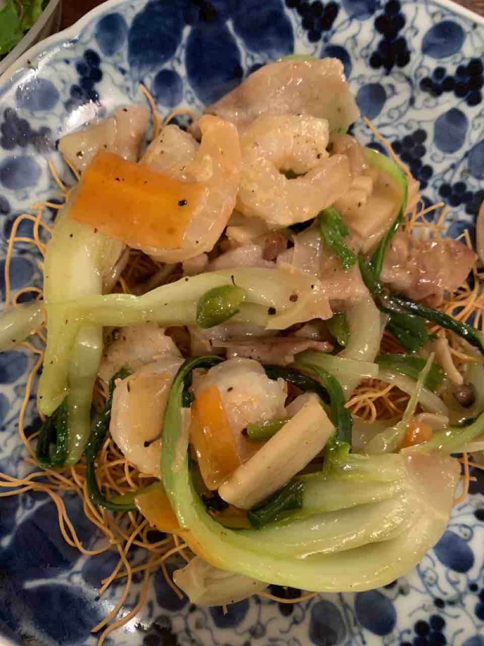 筍、チンゲン菜、人参、椎茸、豚ばら肉、海老、乾燥帆立貝柱 で炒め物を作り、低糖質パリパリ麺にかけて皿うどん風にして食べました。