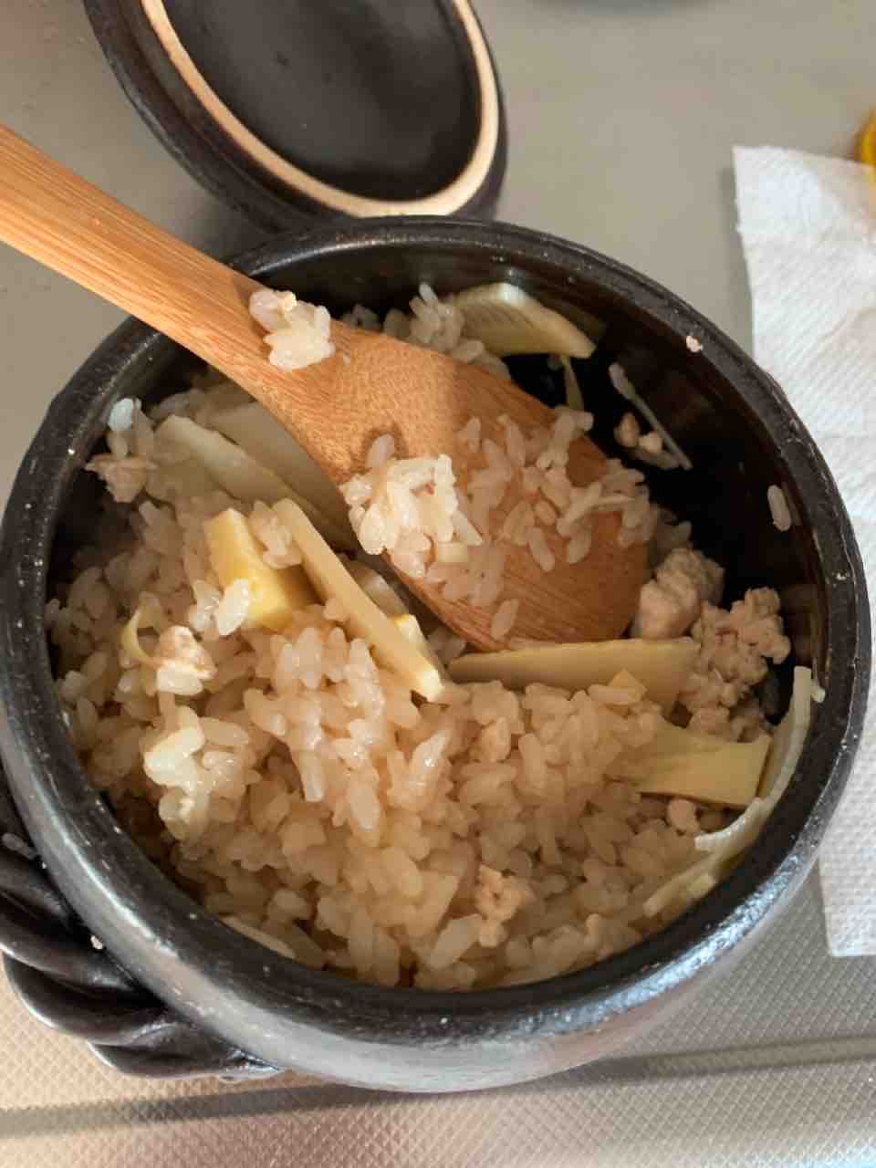 水煮の筍はまず、出汁を引き、鶏挽肉とともに筍ご飯を炊きました。