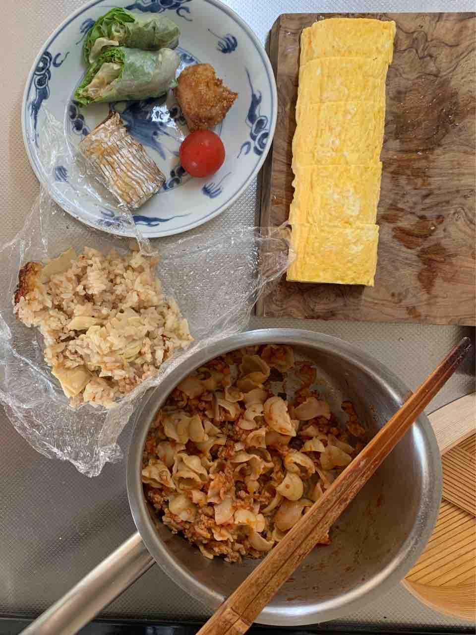 太刀魚塩焼き 出汁巻き玉子 生春巻き 鶏唐揚げ ミートソースパスタ 筍御飯
